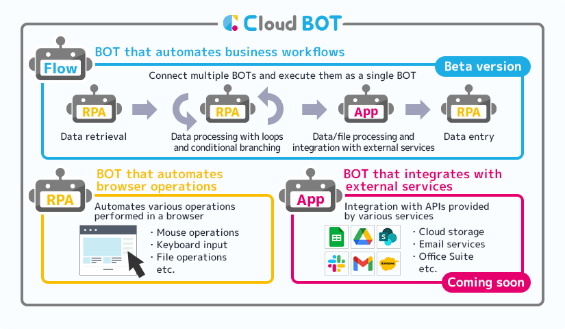 Cloud BOT aims to become a platform that can structure entire business operations by combining three elements: "RPA," "Flow," and "App."