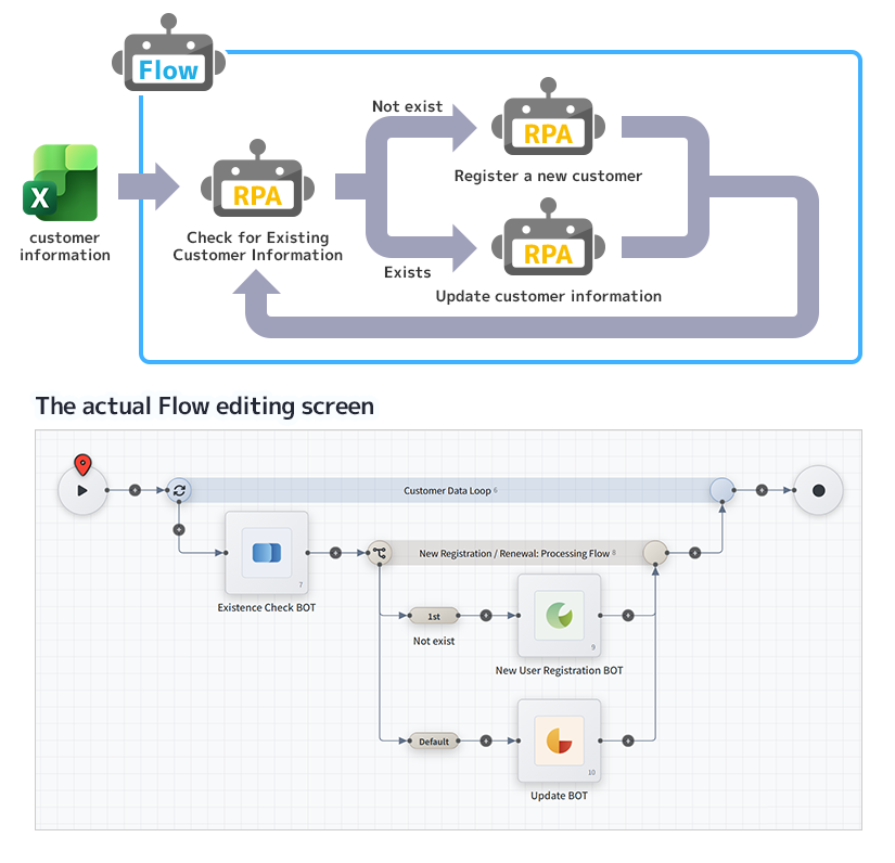 In addition to running BOTs in order, you can set conditional branches and loops, allowing you to automate tasks across multiple steps as one process.