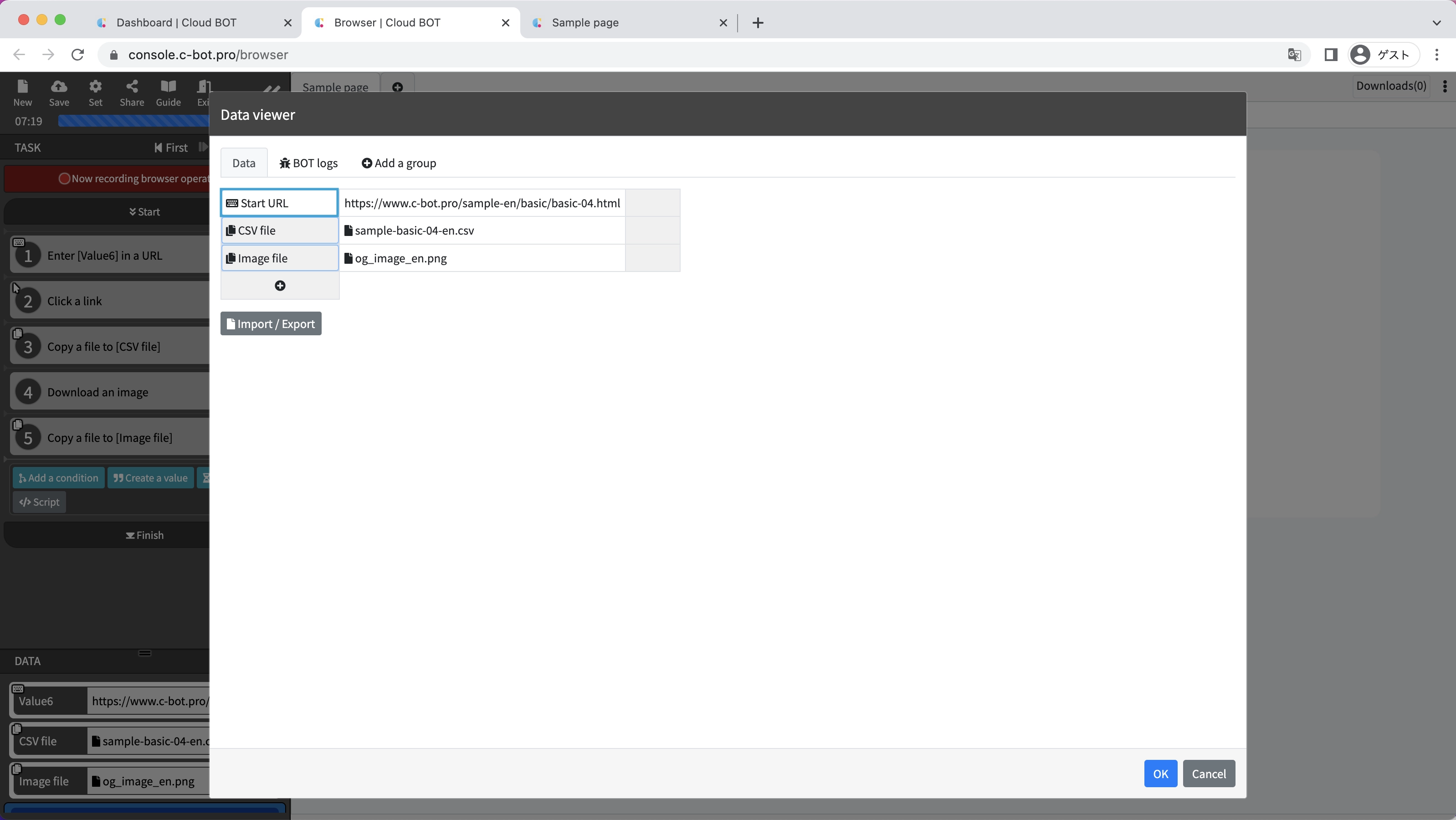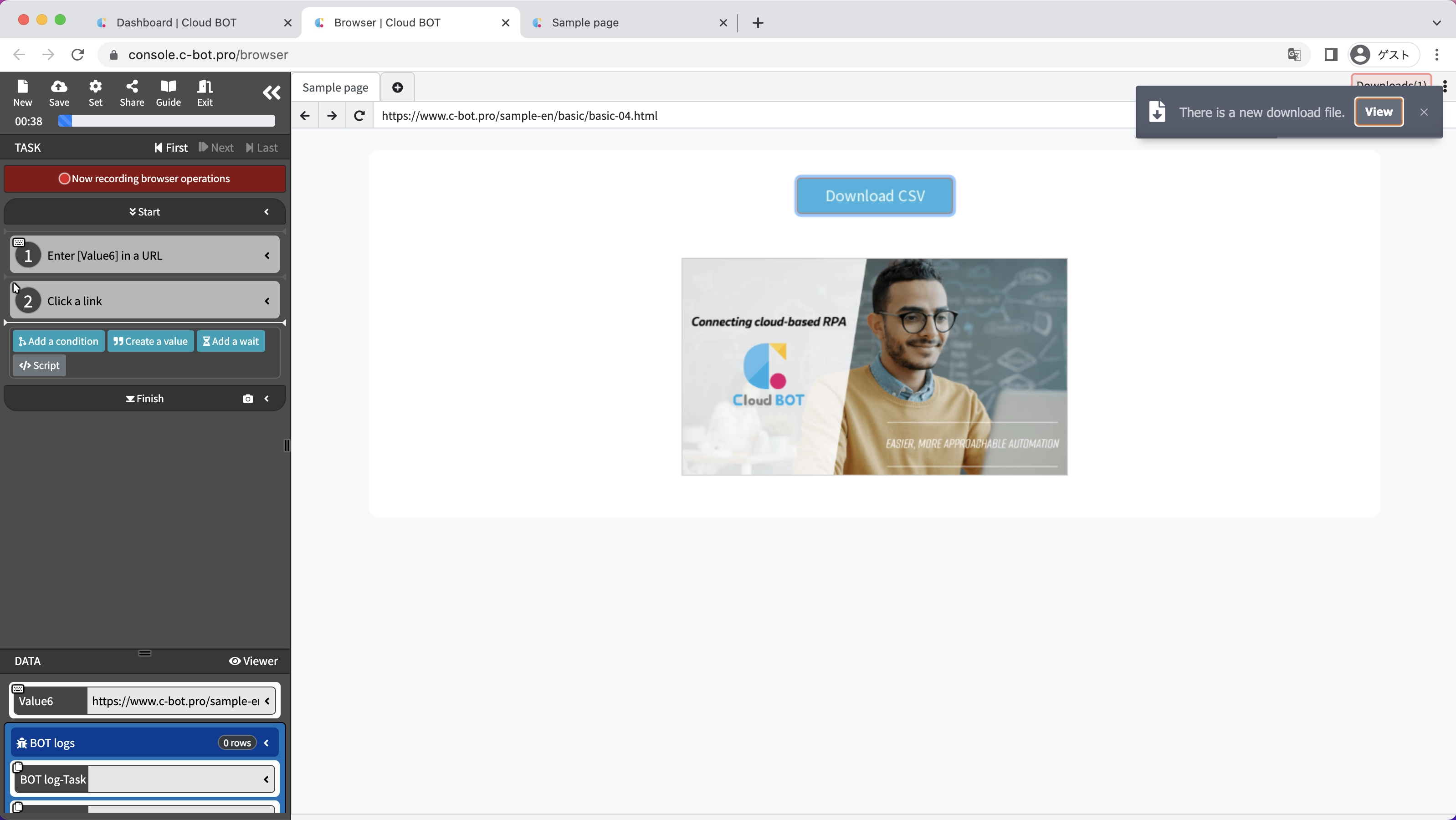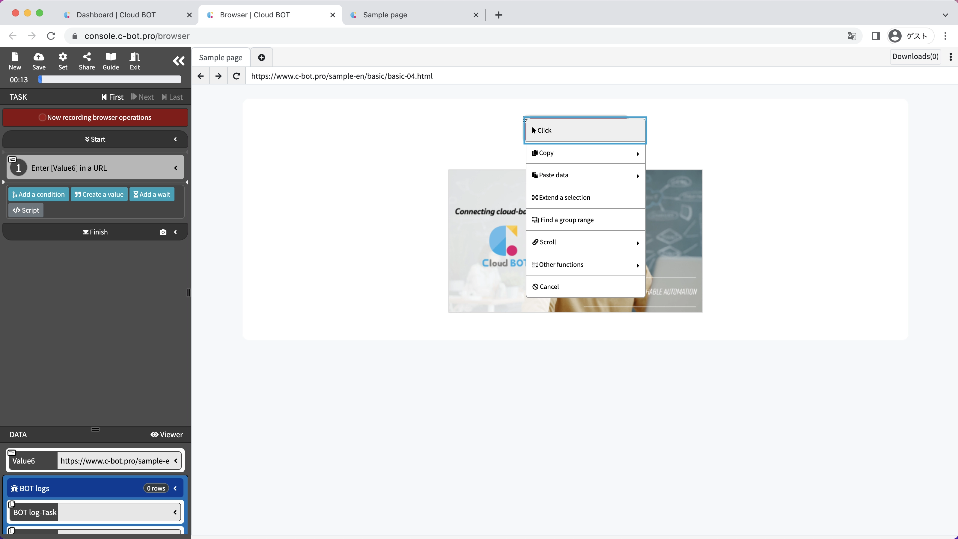 *For basic operations of Cloud BOT, please refer to Basics - Chapter 1-1. Acquiring data from web pages (including an explanation of basic operations).