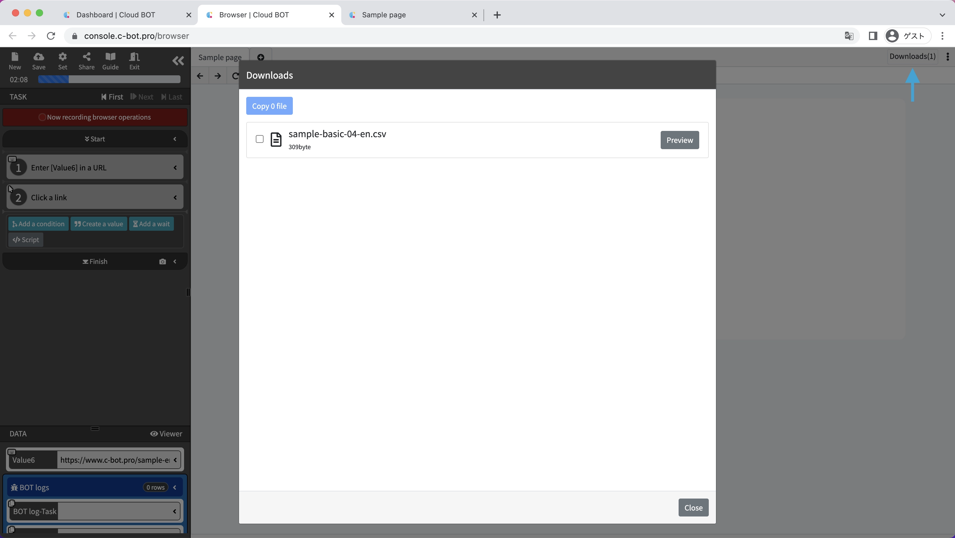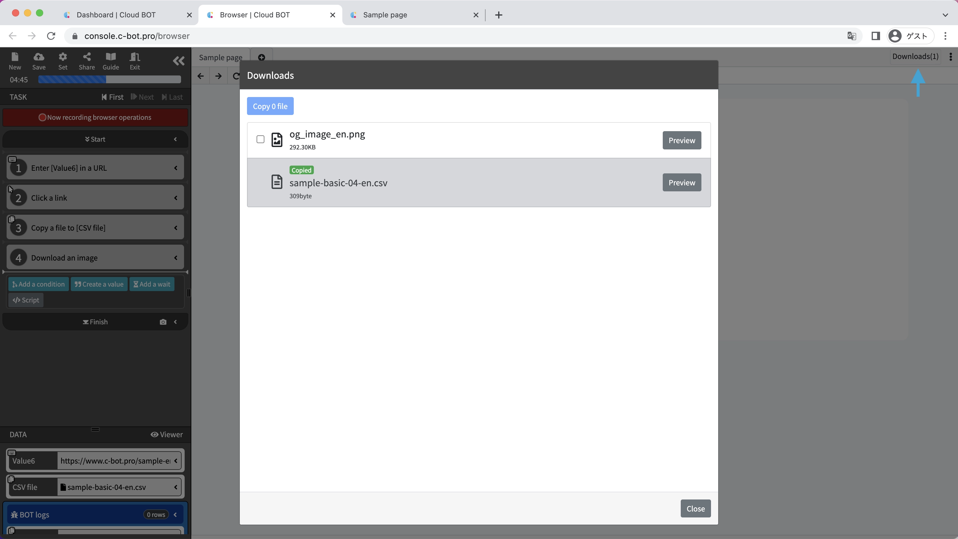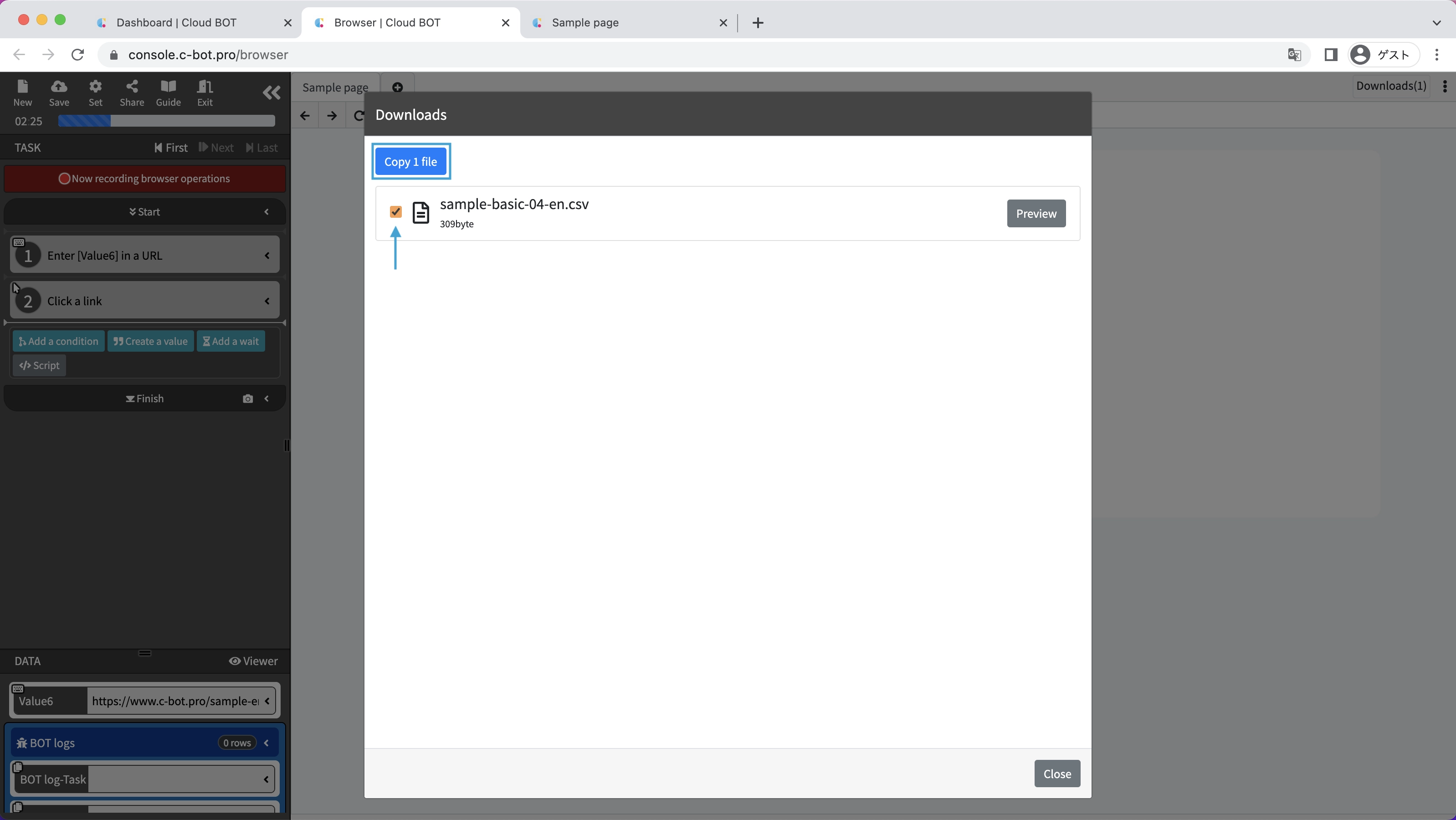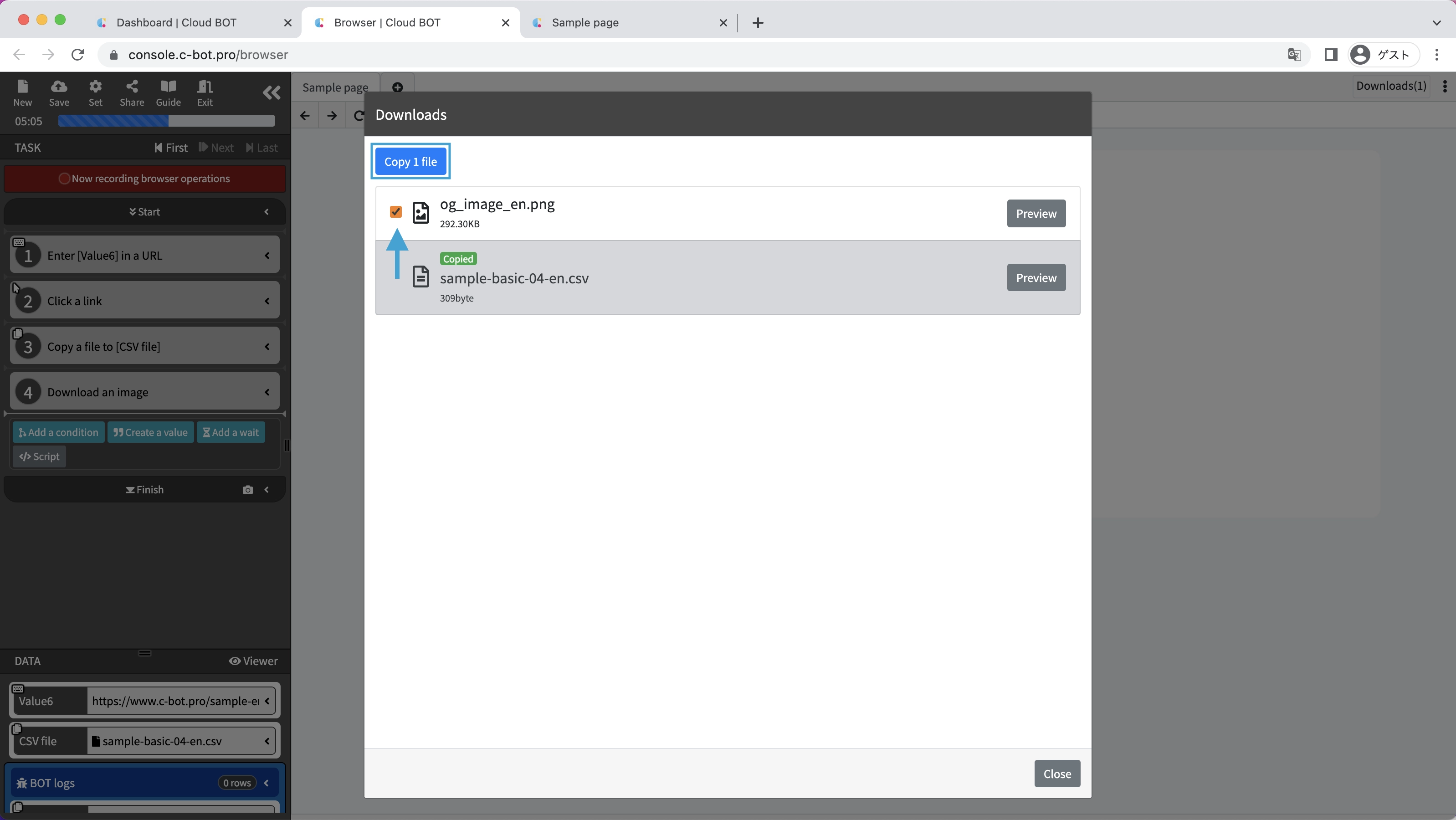 When the virtual browser copies a downloaded file, it can be handled as file data for the BOT.