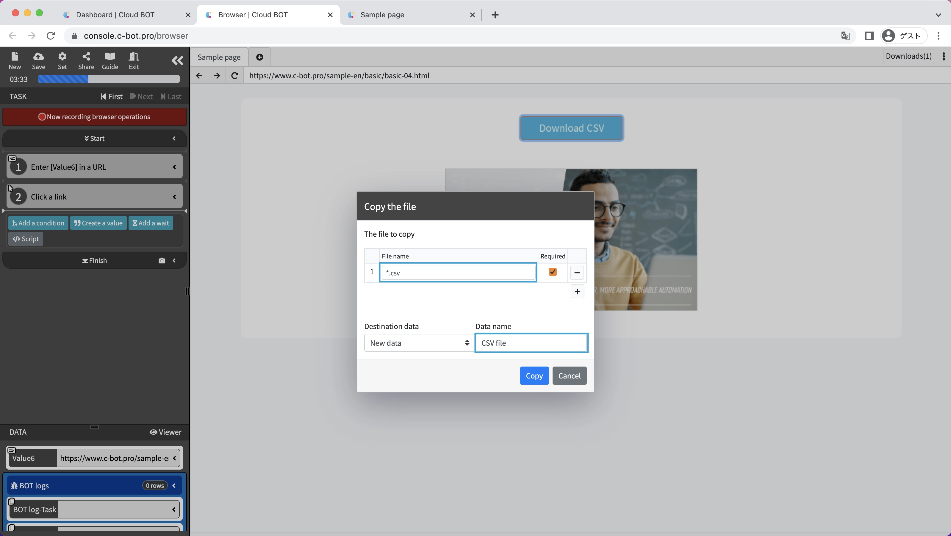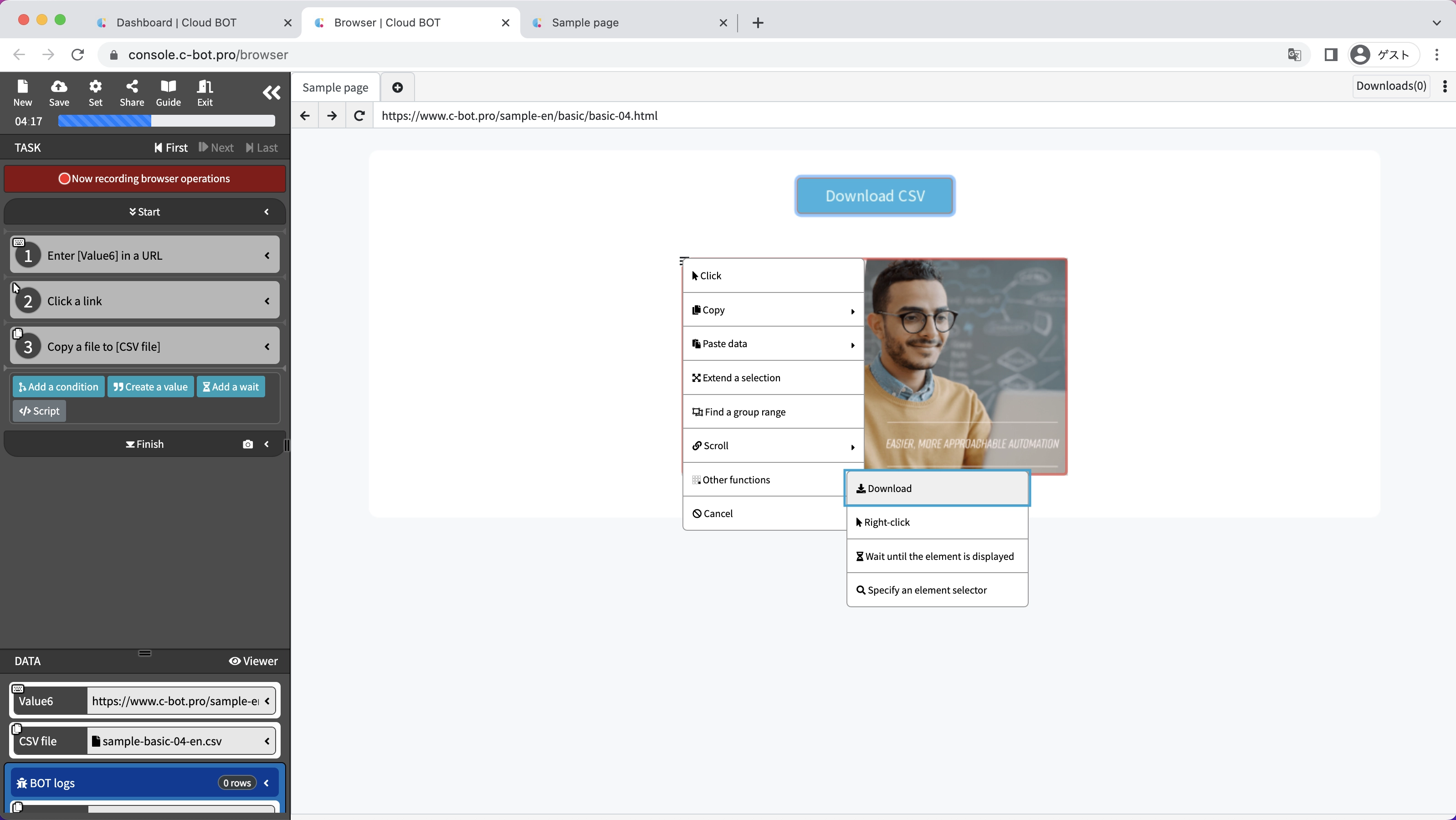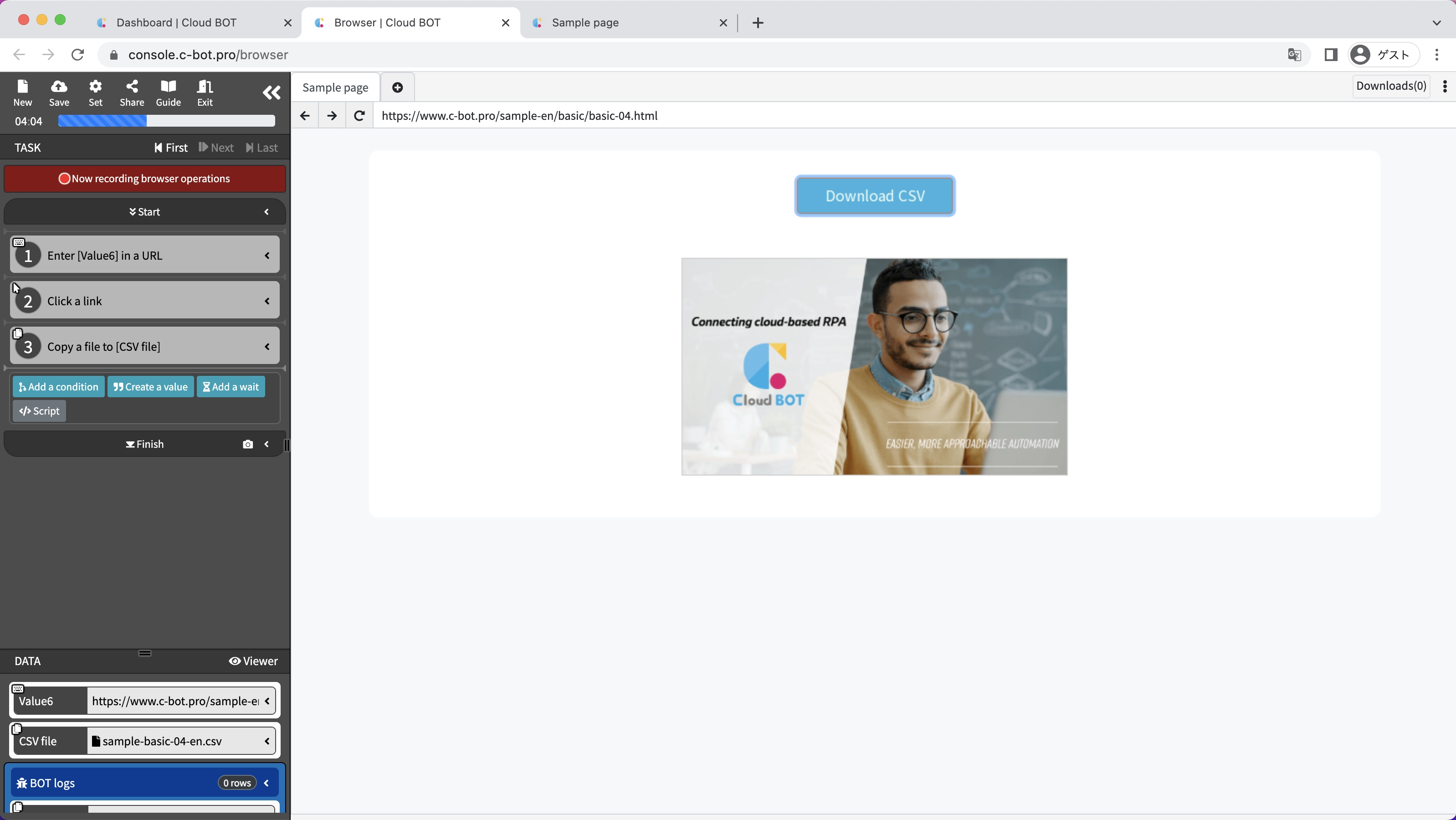 Click the "Record browser operations" button, and record the operation of clicking the "Download CSV" button.