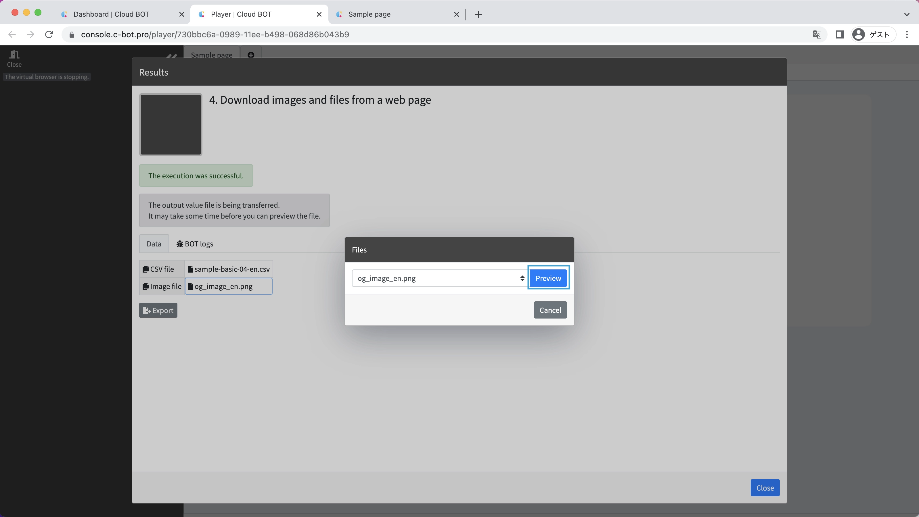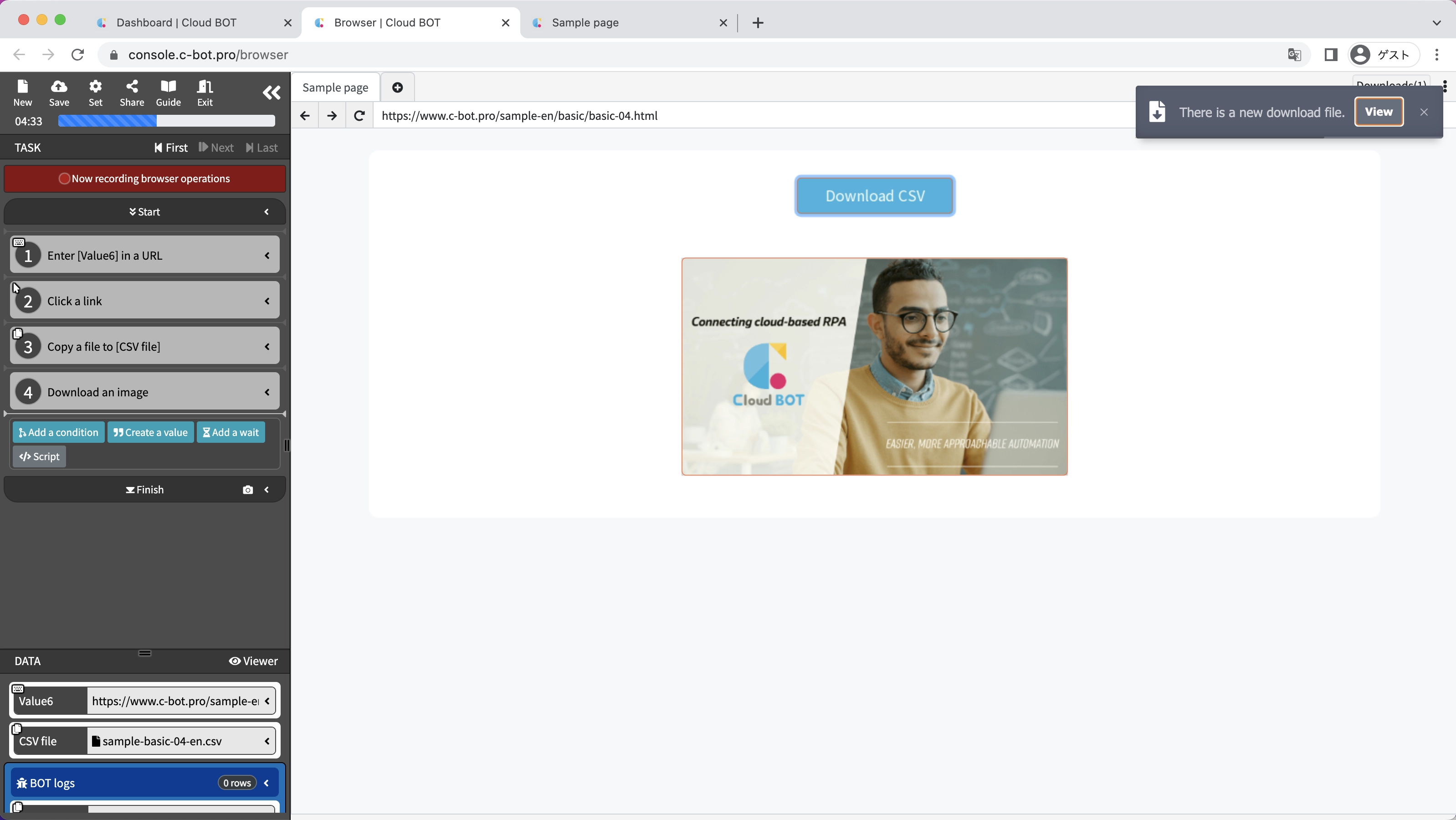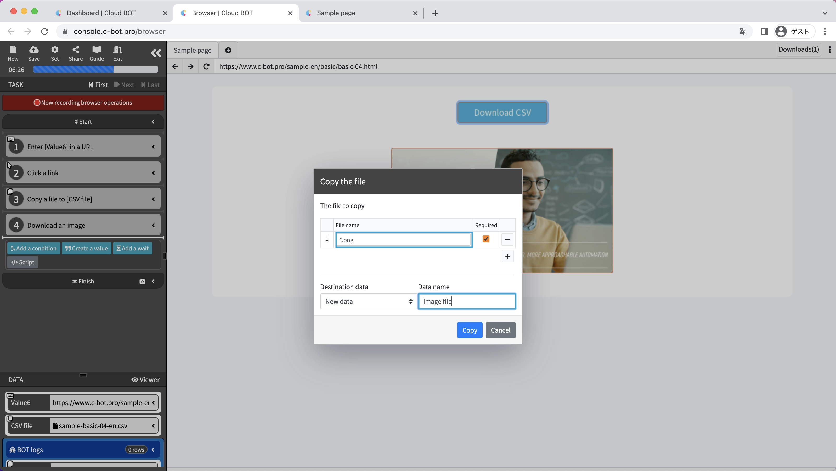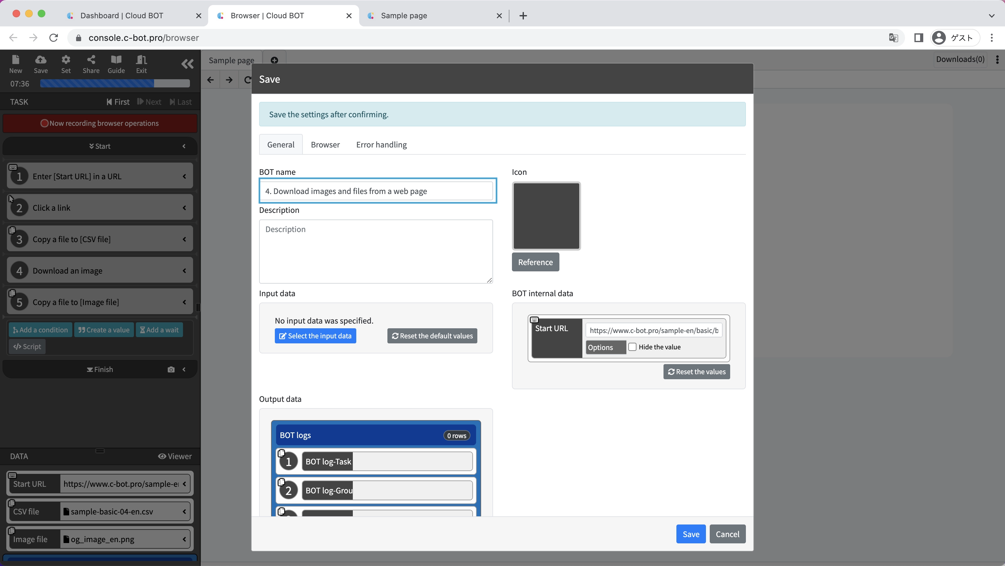 Change the "BOT name" to 1-4. Download images and files from a web page and save the BOT.