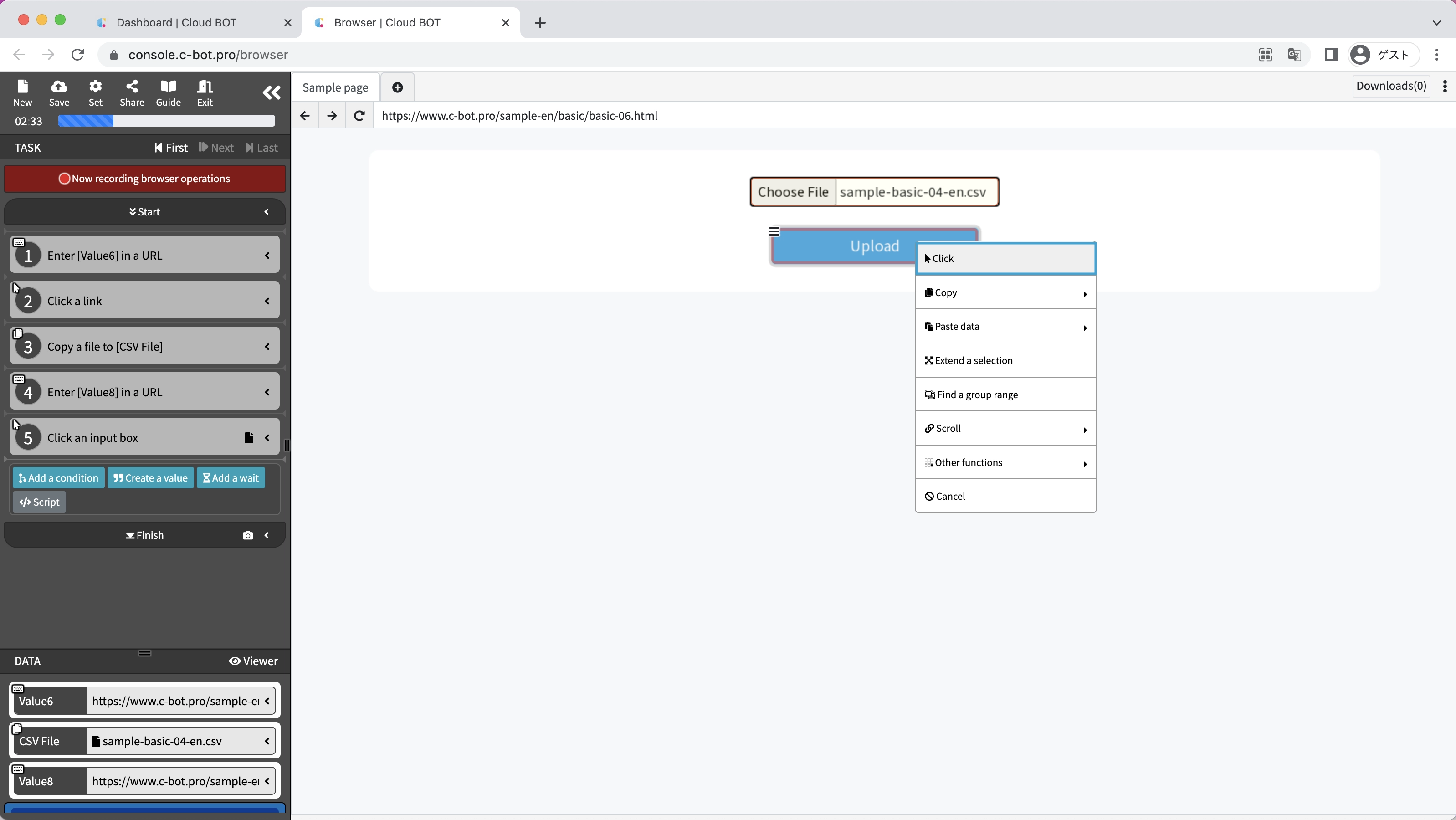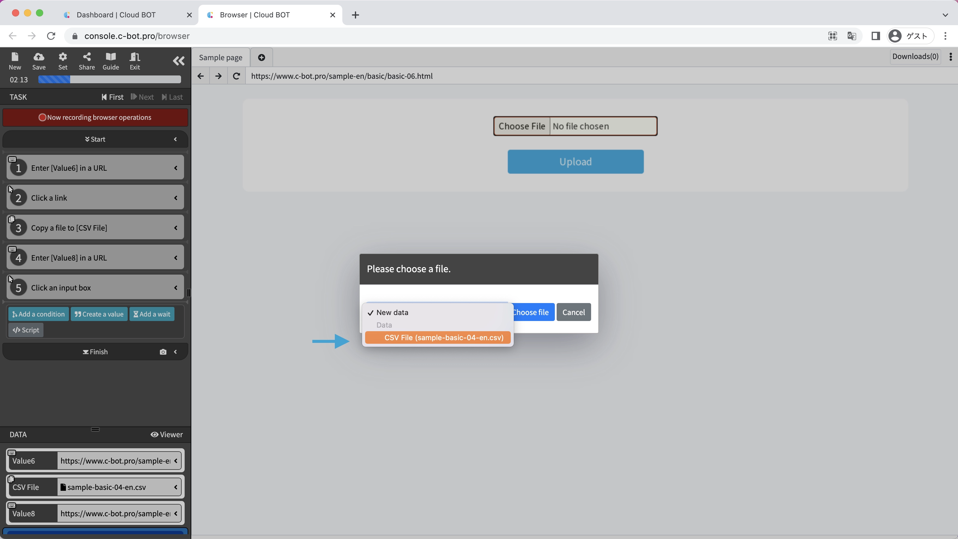 Change the "BOT Name" to 1-6. Upload a file downloaded from a web page to another web page.