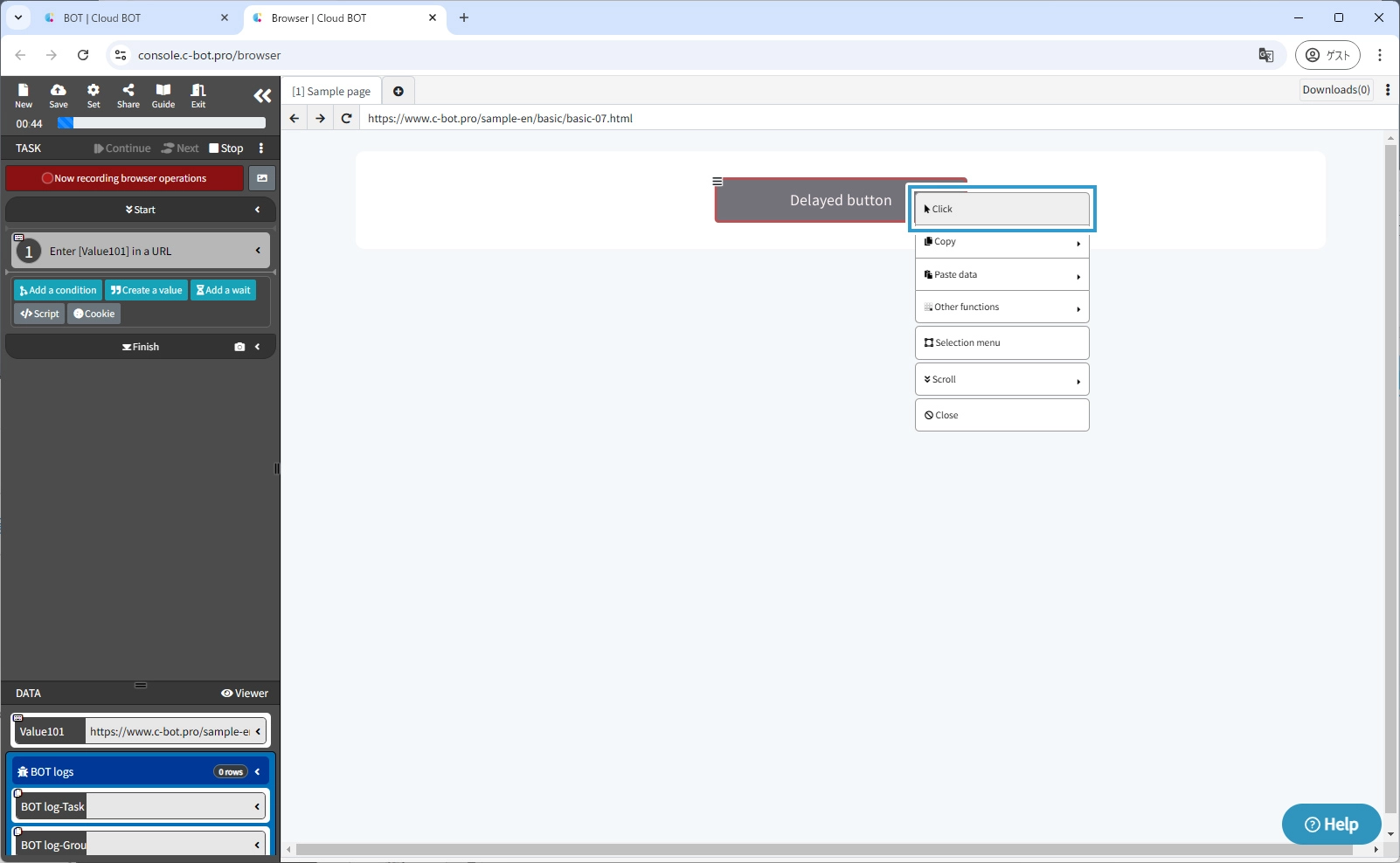 1. Open the BOT editor and access the sample page
