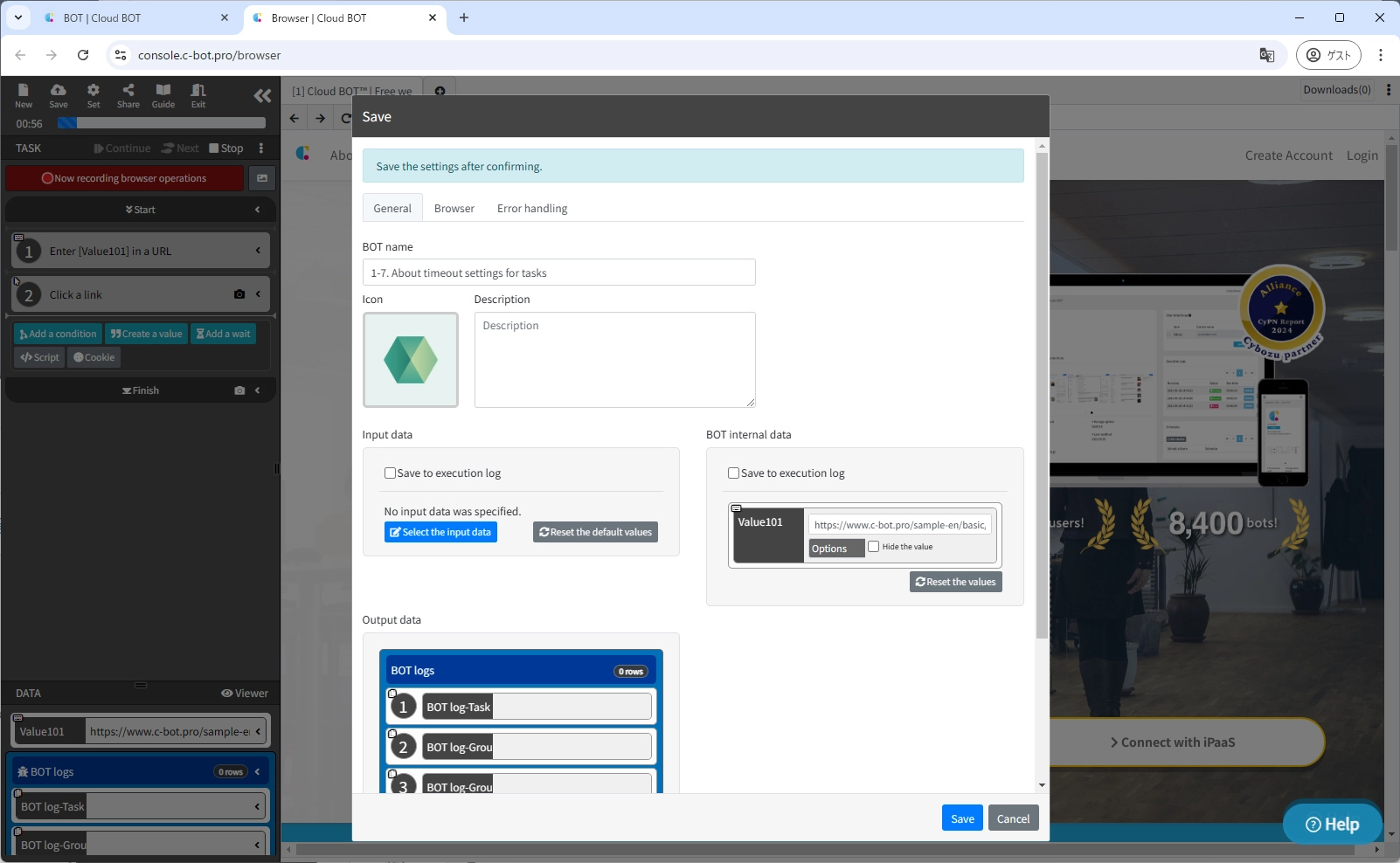 Change the "BOT Name" to 1-7. About timeout settings for tasks and save the BOT.