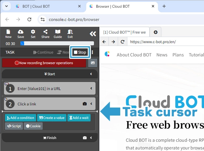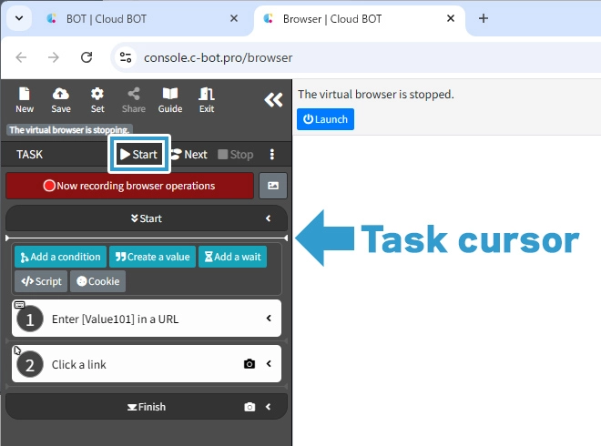 Click "Stop" in the top left corner of the task menu to halt the virtual browser. This action returns the task cursor to the beginning.