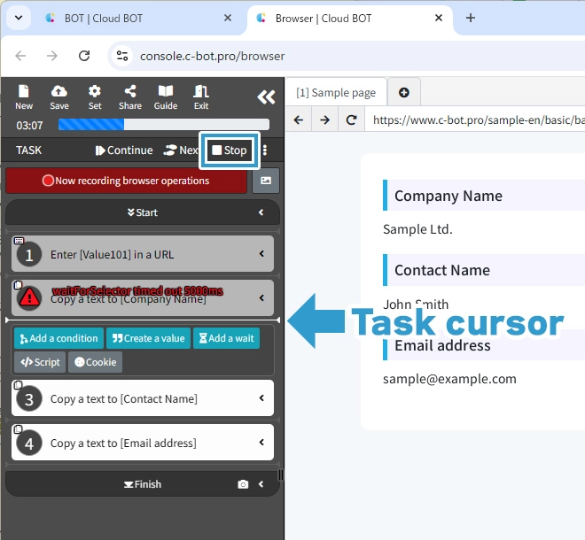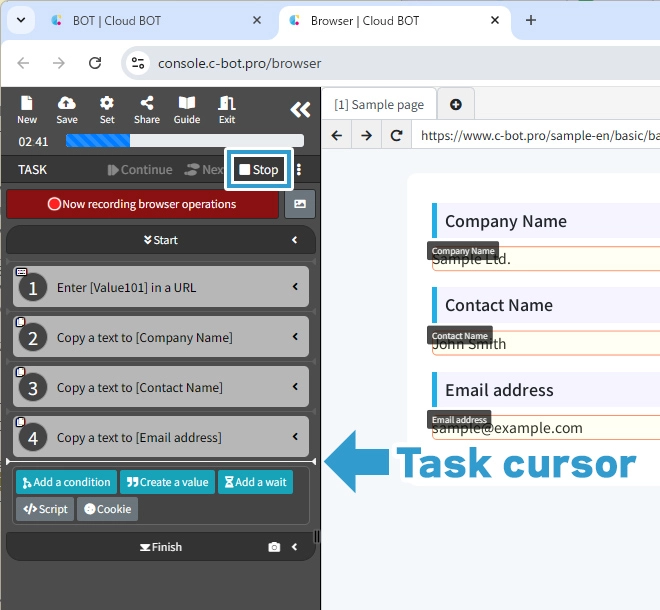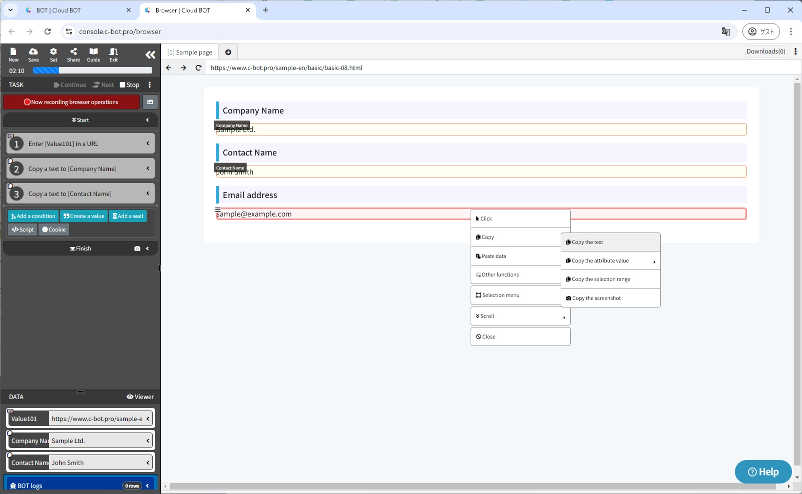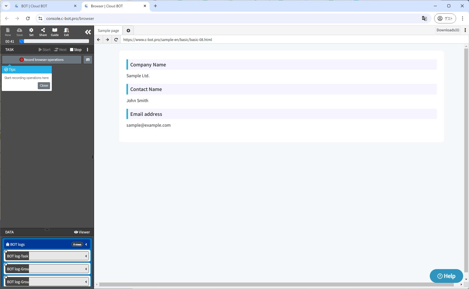 Click the "Record browser operations" button, and records the operation of copying "Sample Ltd.", "John Smith", and "sample@example.com" displayed on the page as the company name, contact name, and email address, respectively.