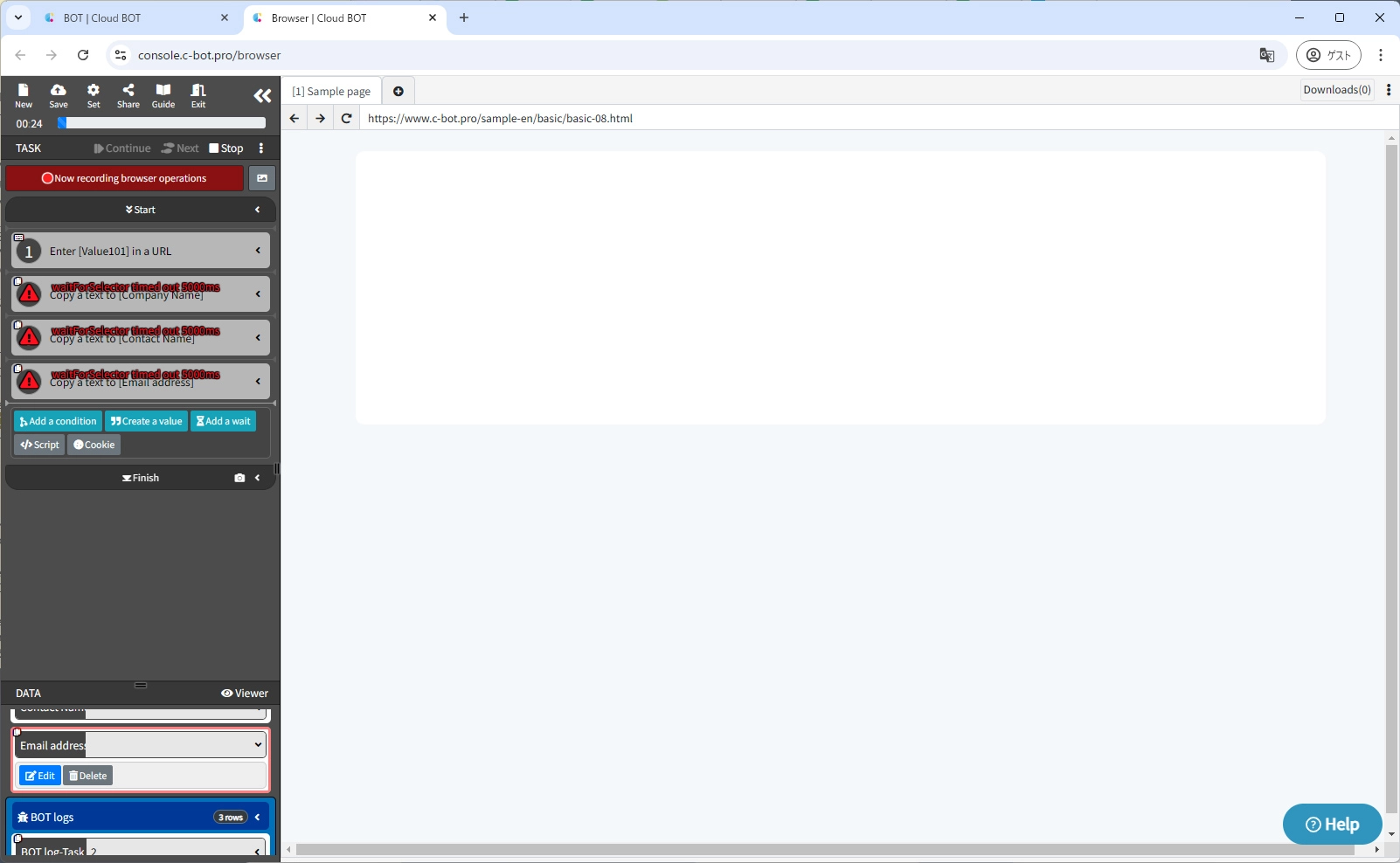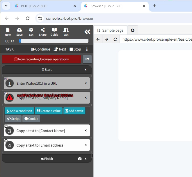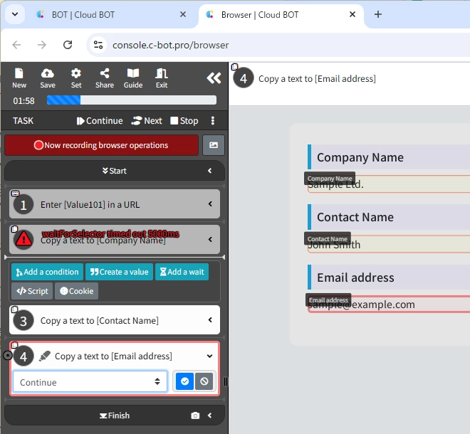 The "wait For Selector timed out 5000ms" is displayed and the task is in error, but it can be confirmed that the process is proceeding to the end.