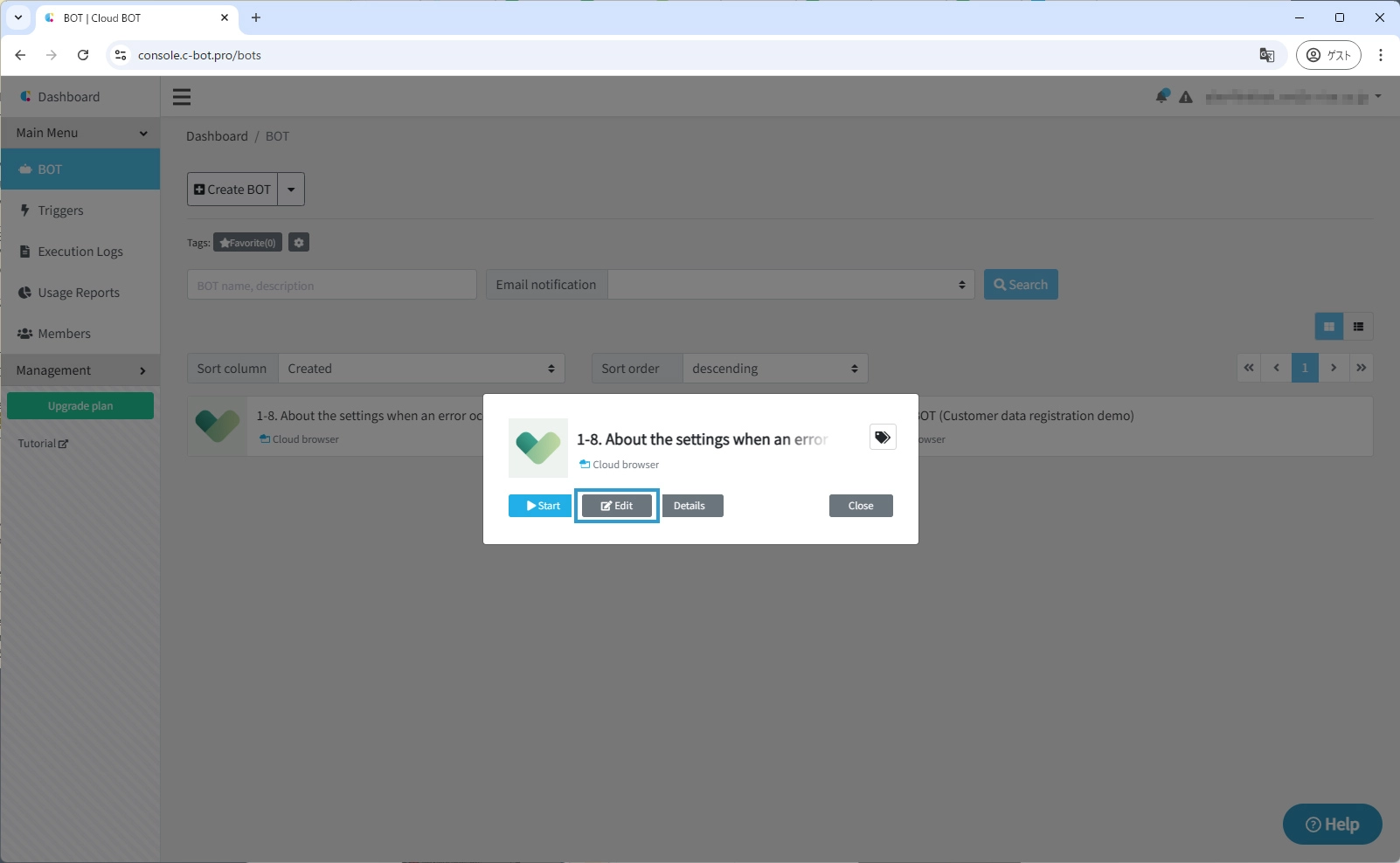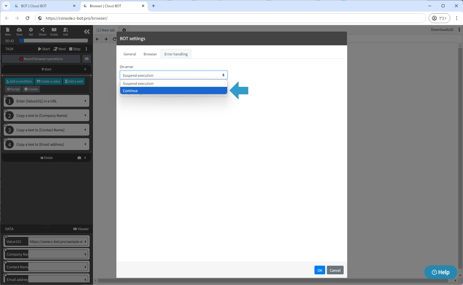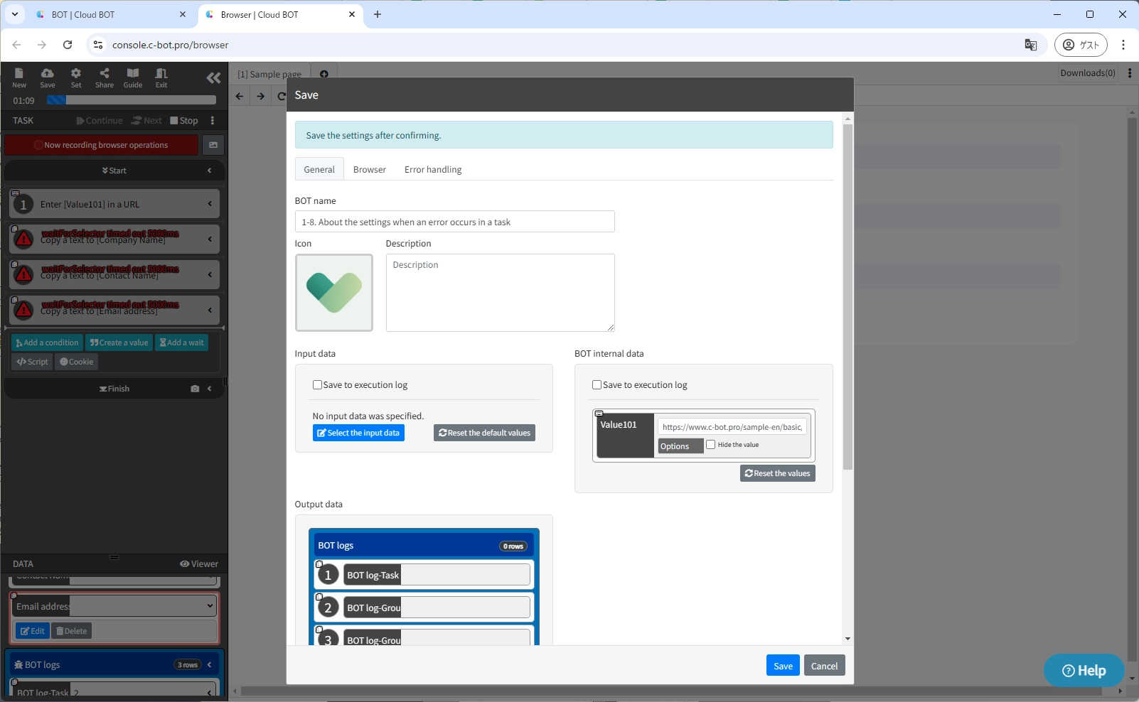 Change the "BOT Name" to 1-8. About the settings when an error occurs in a task.