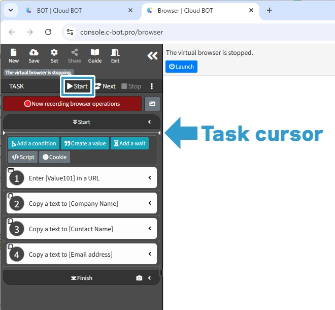 Click "Stop" in the top left corner of the task menu to halt the virtual browser. This action returns the task cursor to the beginning.