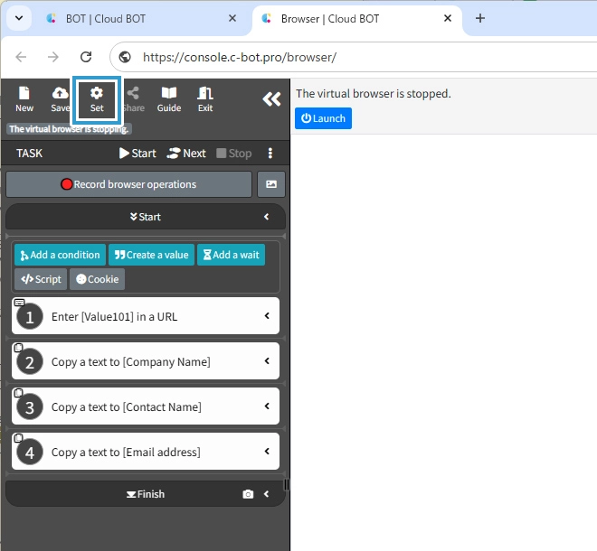 The BOT editor will open, click on "Set" in the upper left corner of the screen.