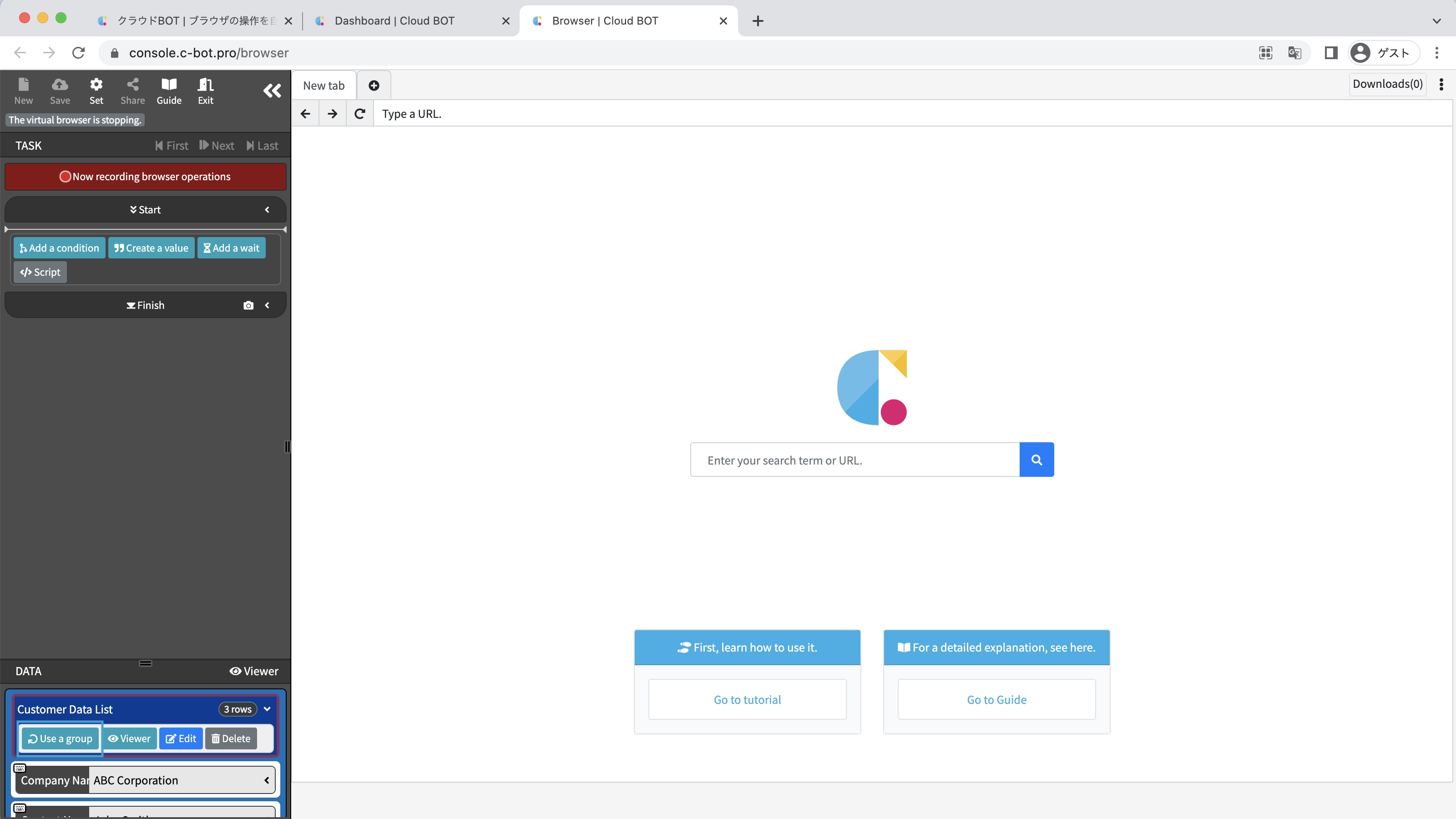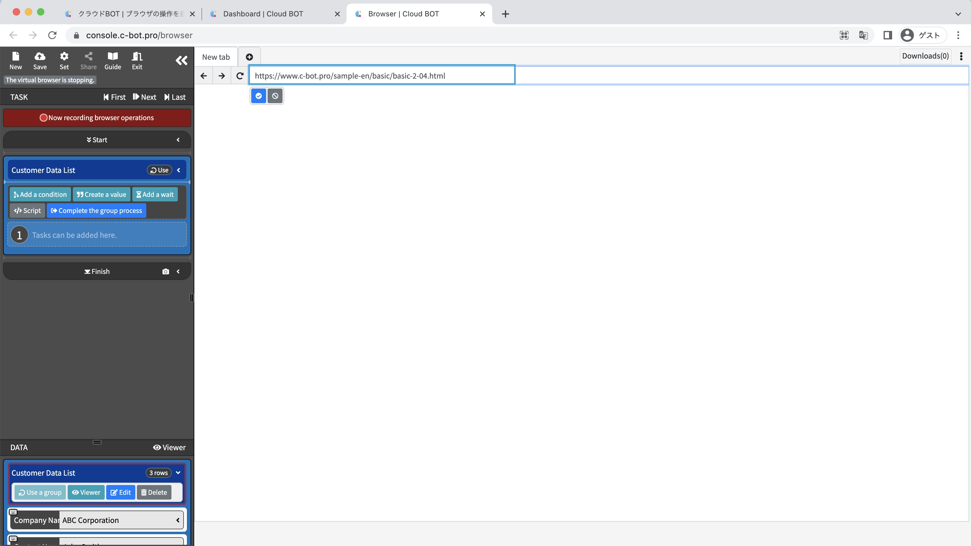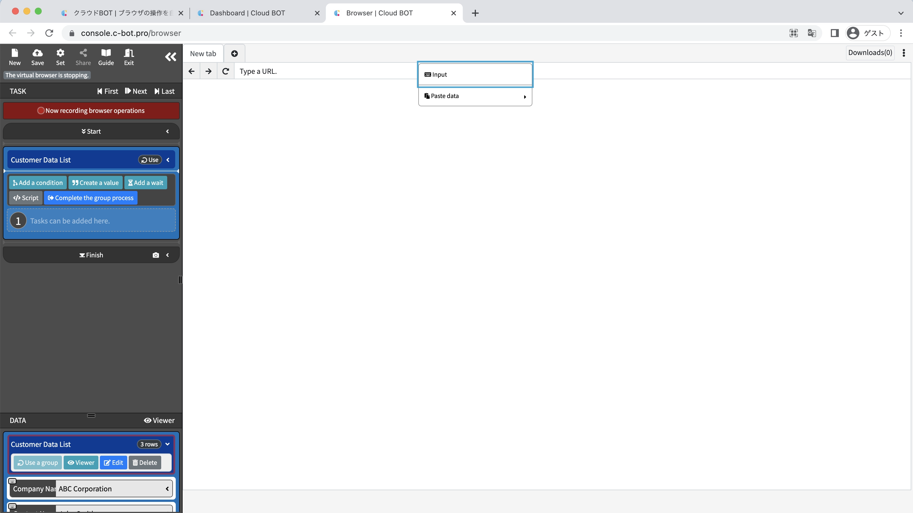 *For basic operations of Cloud BOT, please refer to Basics - Chapter 1-1. Acquiring data from web pages (including an explanation of basic operations).