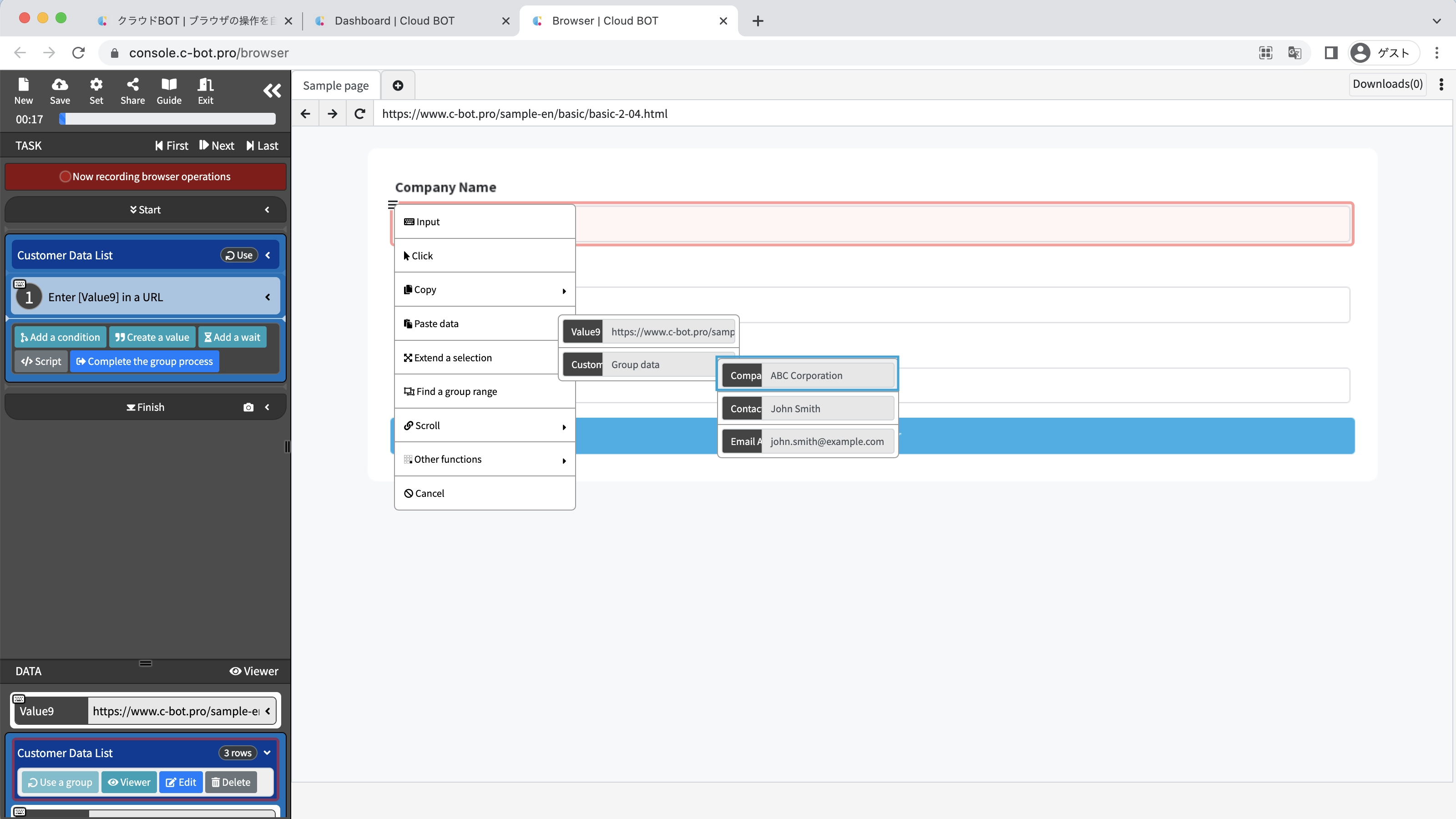 Click on the input form below the "Company Name" on the page, then click "Paste Data" > "Customer Data List" > "Company Name" from the operation menu.