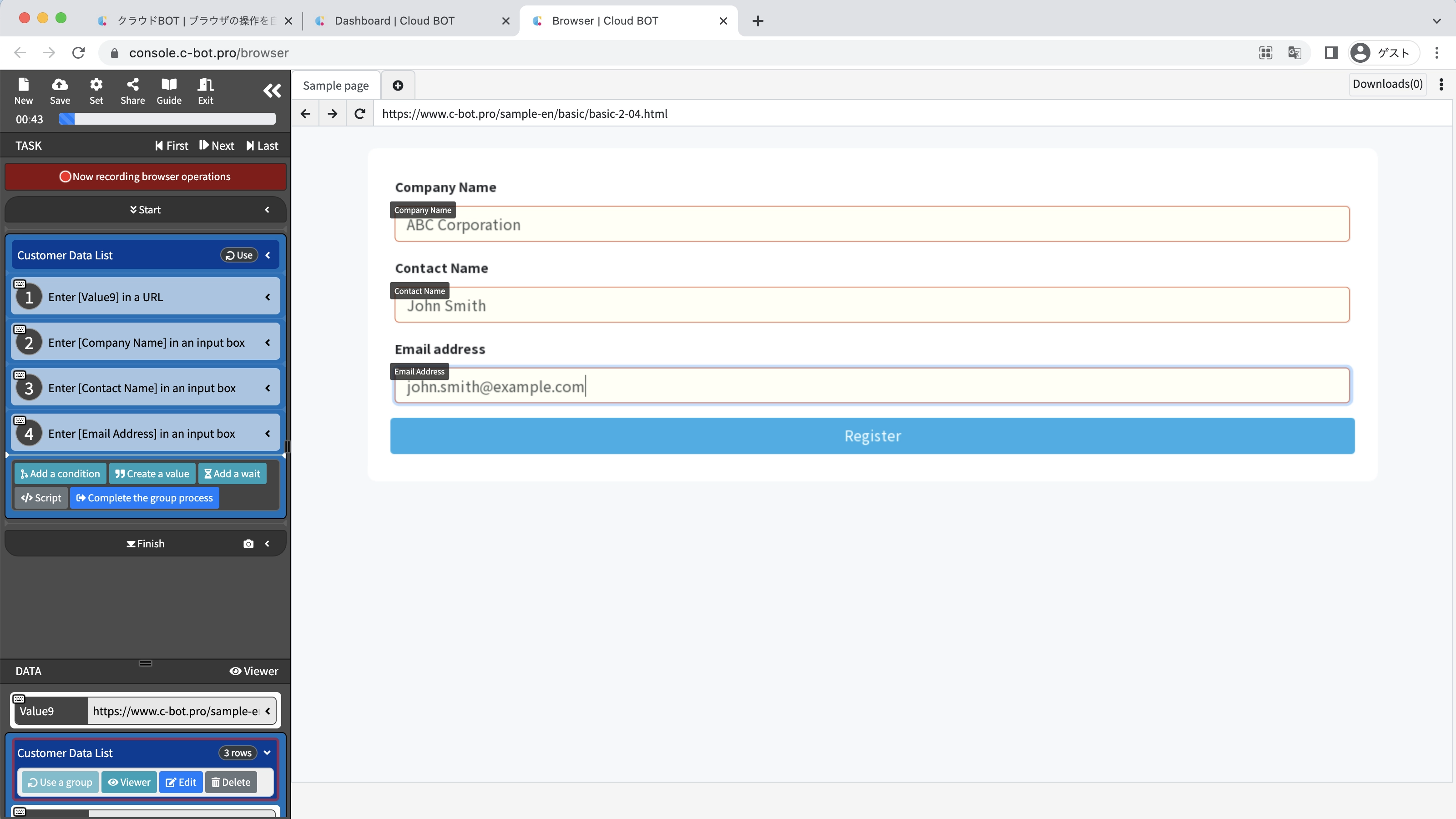 3. Record the operation to register data.