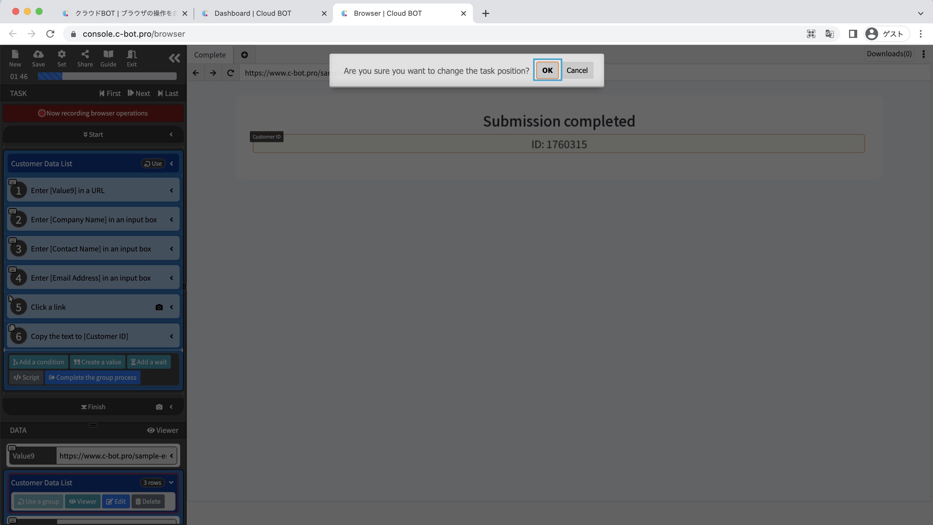 The "Customer Data List" is inserted into the task.