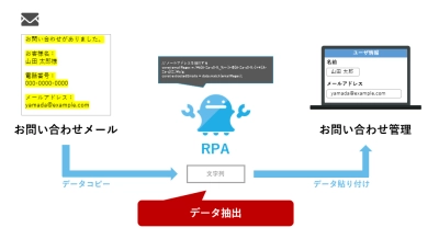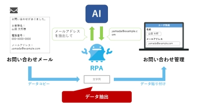 AIに対して、抽出元のテキストデータと抽出したい項目を依頼することで、プログラムコードに頼らずに抽出作業を実現できます。データの抽出が完了すれば、あとはRPAが自動的に情報を自動登録します。