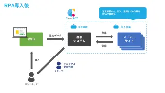 RPA導入後は「注文内容の確認とメーカーサイトでの仕入れ作業」および「仕入れた商品の基幹システムへの登録作業」をロボットが自動で処理するようになり、スタッフはロボットの処理結果をチェックし、納品対応に集中できる体制になりました。その結果、該当業務にかかる作業時間は半分以下に削減されました。
