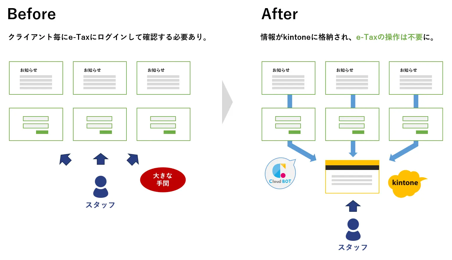 山田様:e-Taxから申告前のお知らせの内容を取得し、kintoneに格納するBOTです。各クライアントのkintone詳細画面から実行ボタンをクリックすると、BOTがe-Taxから各クライアントのお知らせを取得します。取得した情報はkintoneのサブテーブルに登録されるので、私たちが e-Tax に都度ログインする必要がなくなりました。