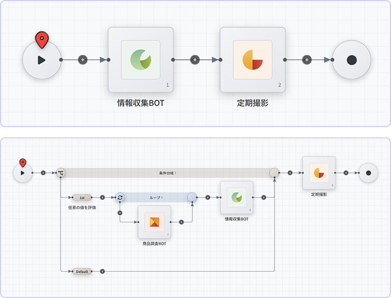 各BOTを順番に動かすだけでなく、条件に応じた分岐やループ処理も設定できるため、複数の工程にまたがる業務をまとめて自動化できます。