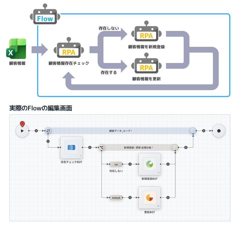 例えば、Excelデータをもとに顧客データを更新する処理を実装する場合、Flowを活用することで以下のような処理を分割して構築できます。