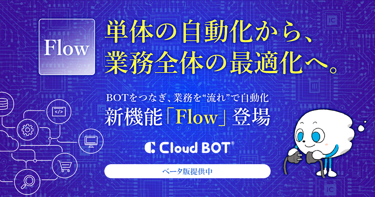 『Flow』 ベータ版の提供を開始しました。 2026.04.14 『Flow』は、クラウドBOTで作成した複数のBOTを連結し、一つのBOTとして実行・管理できる機能です。複雑なプログラミングは一切不要で、ノーコードで高度なワークフローを構築できます。詳しくはこちらをご覧下さい。https://www.c-bot.pro/ja/flow/『Flow』 ベータ版について無償提供:ベータ版は実験的な機能として、多くの皆様にご利用いただき、フィードバックをもとに機能改善を図るために無償でご提供しております。