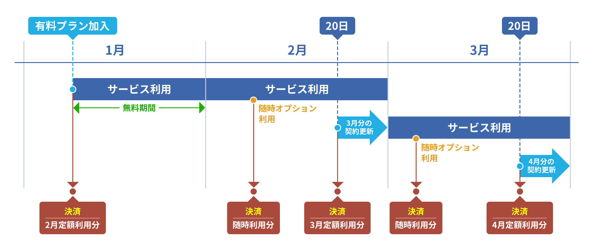 ・以降は、契約更新月の20日に、次の契約期間分の料金を先払いで決済いたします。