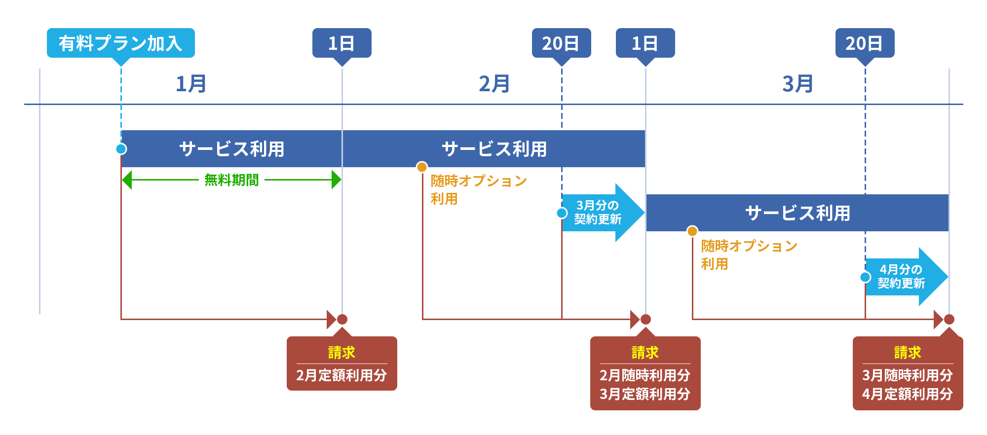 ・毎月1日に、次の契約期間分の料金および前月にご利用いただいた随時オプションの利用料金を含むご請求書を送付いたします。