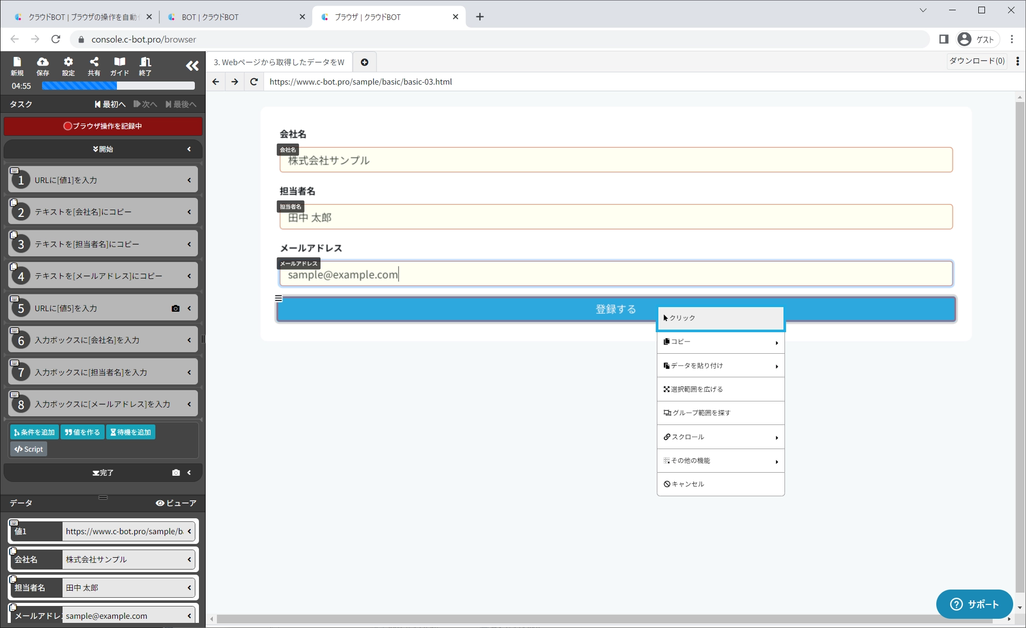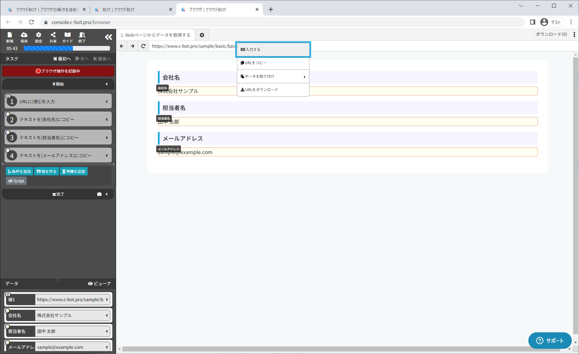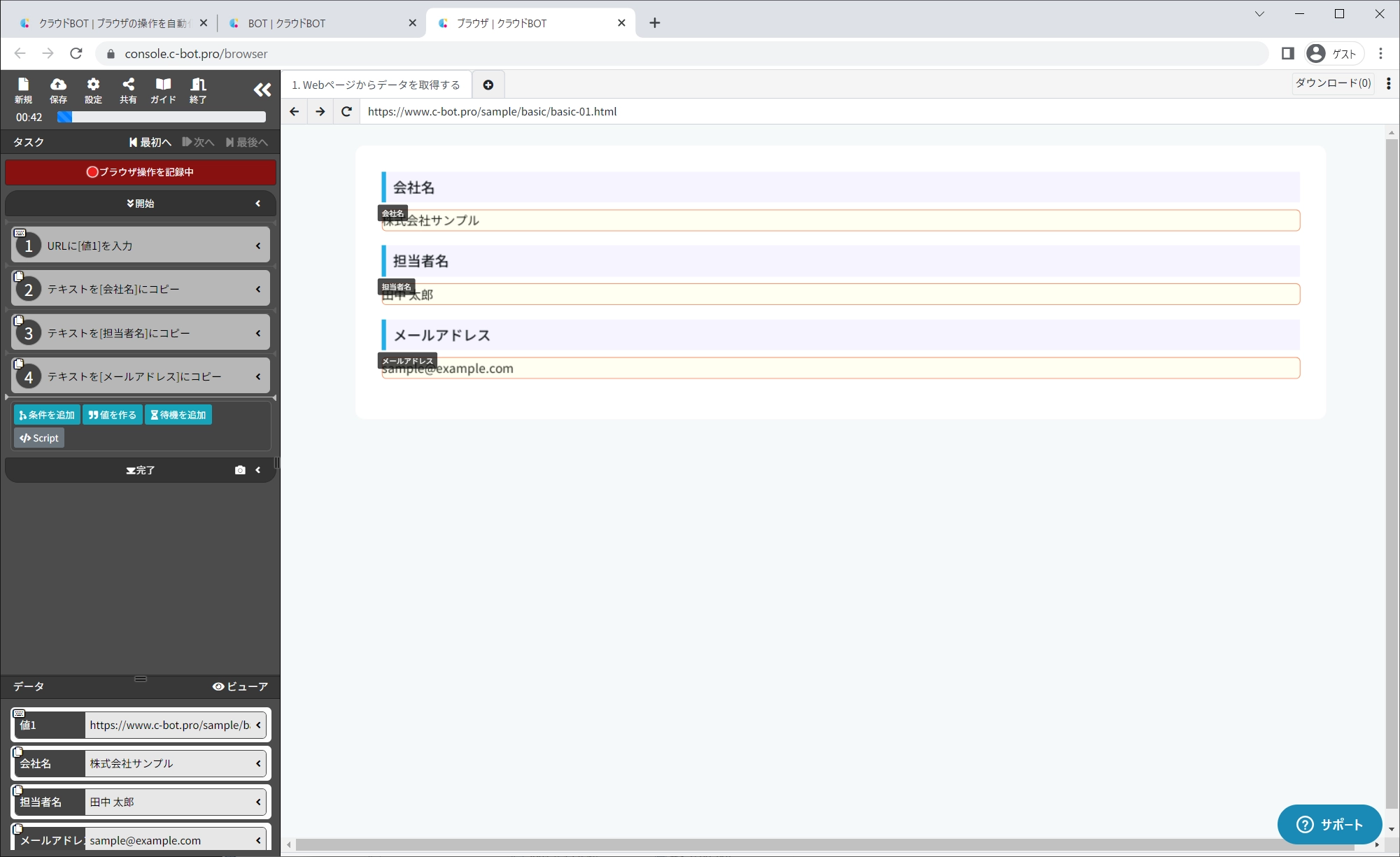 ページ内に表示されている、”株式会社サンプル”、”田中 太郎”、”sample@example.com”をそれぞれ、会社名、担当者名、メールアドレスとしてコピーする操作を記録します。
