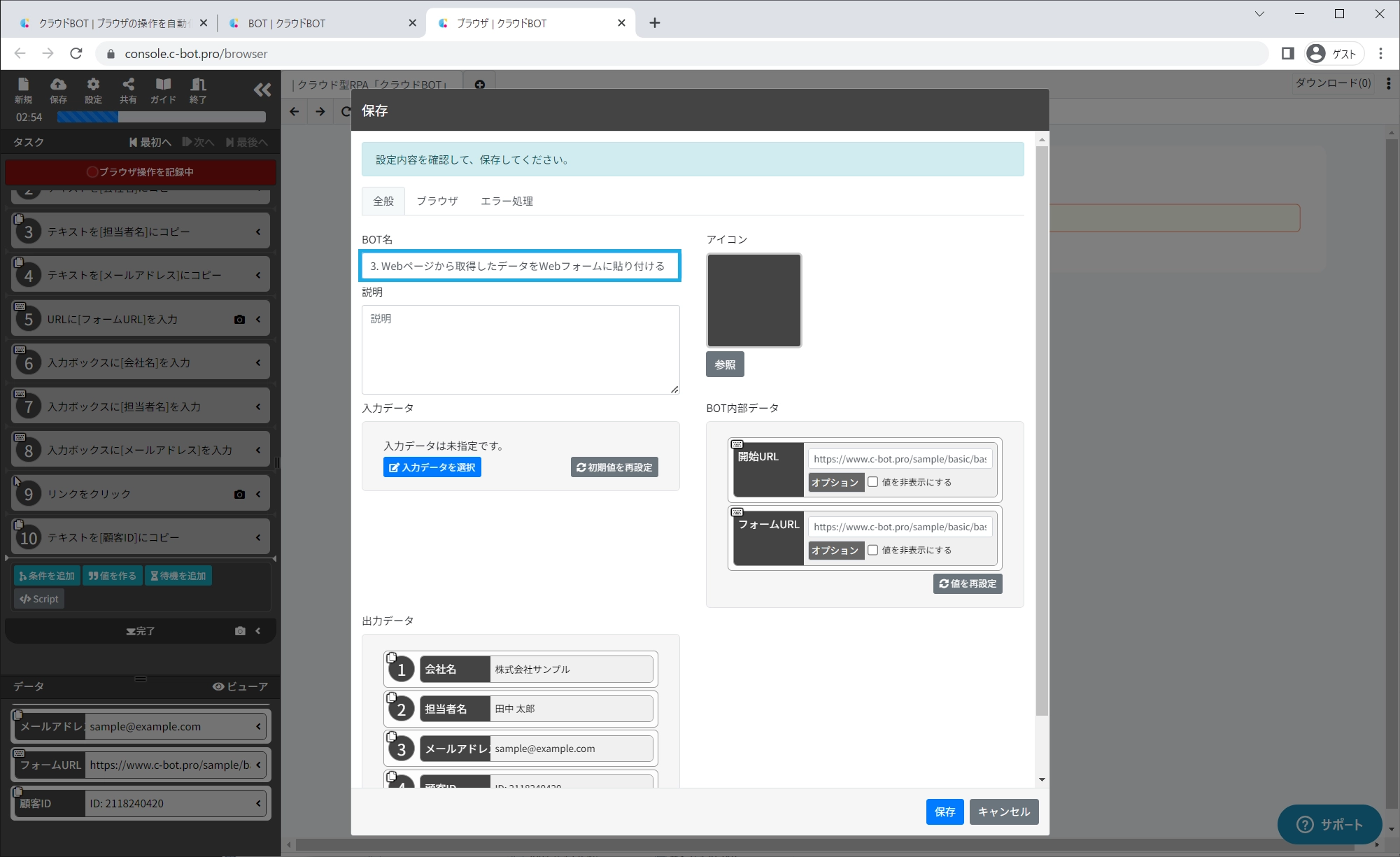 ”BOT名”を1-3. Webページから取得したデータをWebフォームに貼り付けるに変更し、BOTを保存します。