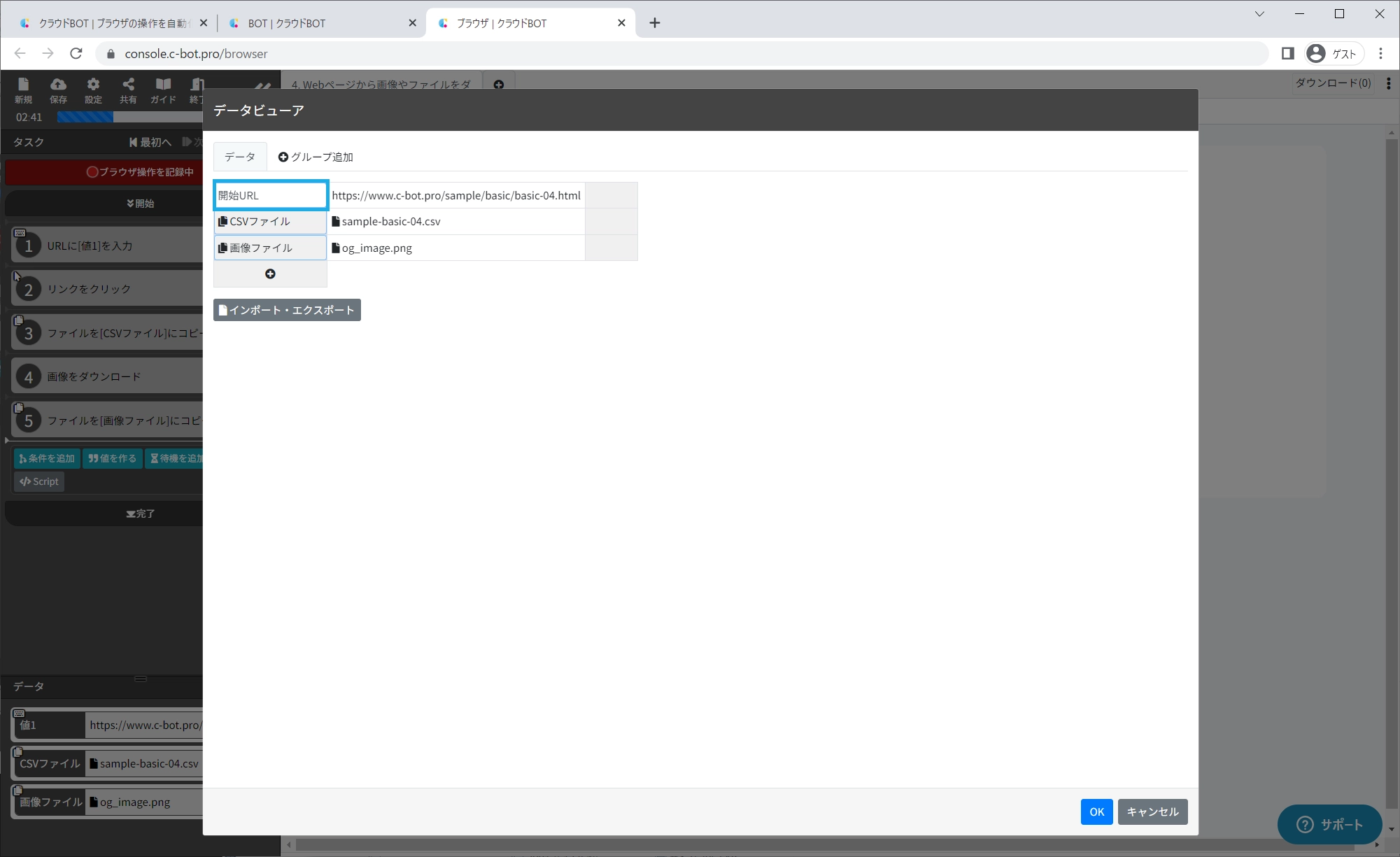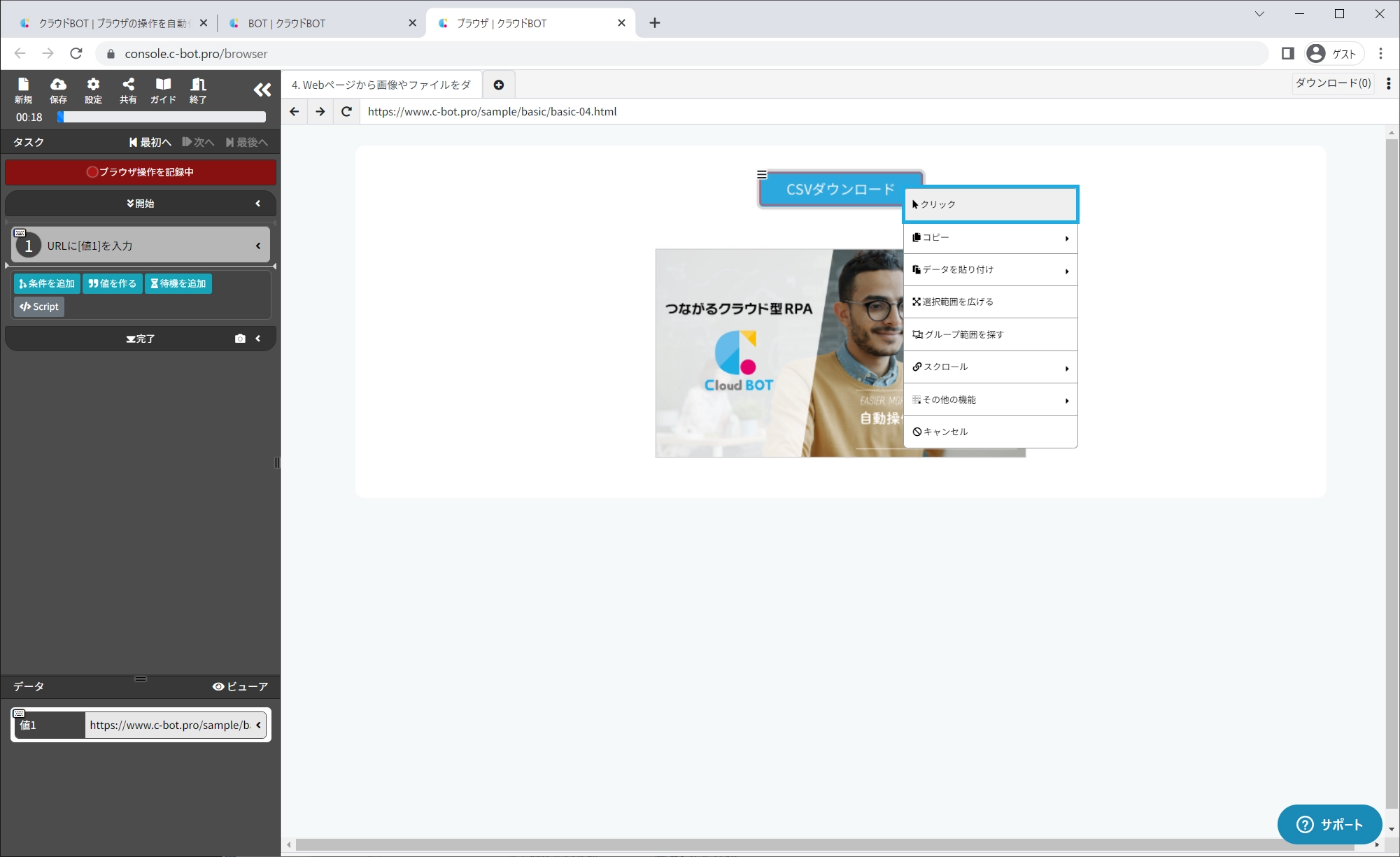※クラウドBOTの基本的な操作につきましては、『基本編 - 1-1. Webページからデータを取得する (基本操作の解説を含む)』をご参照下さい。