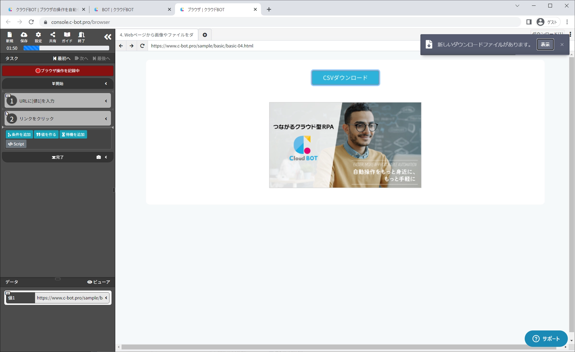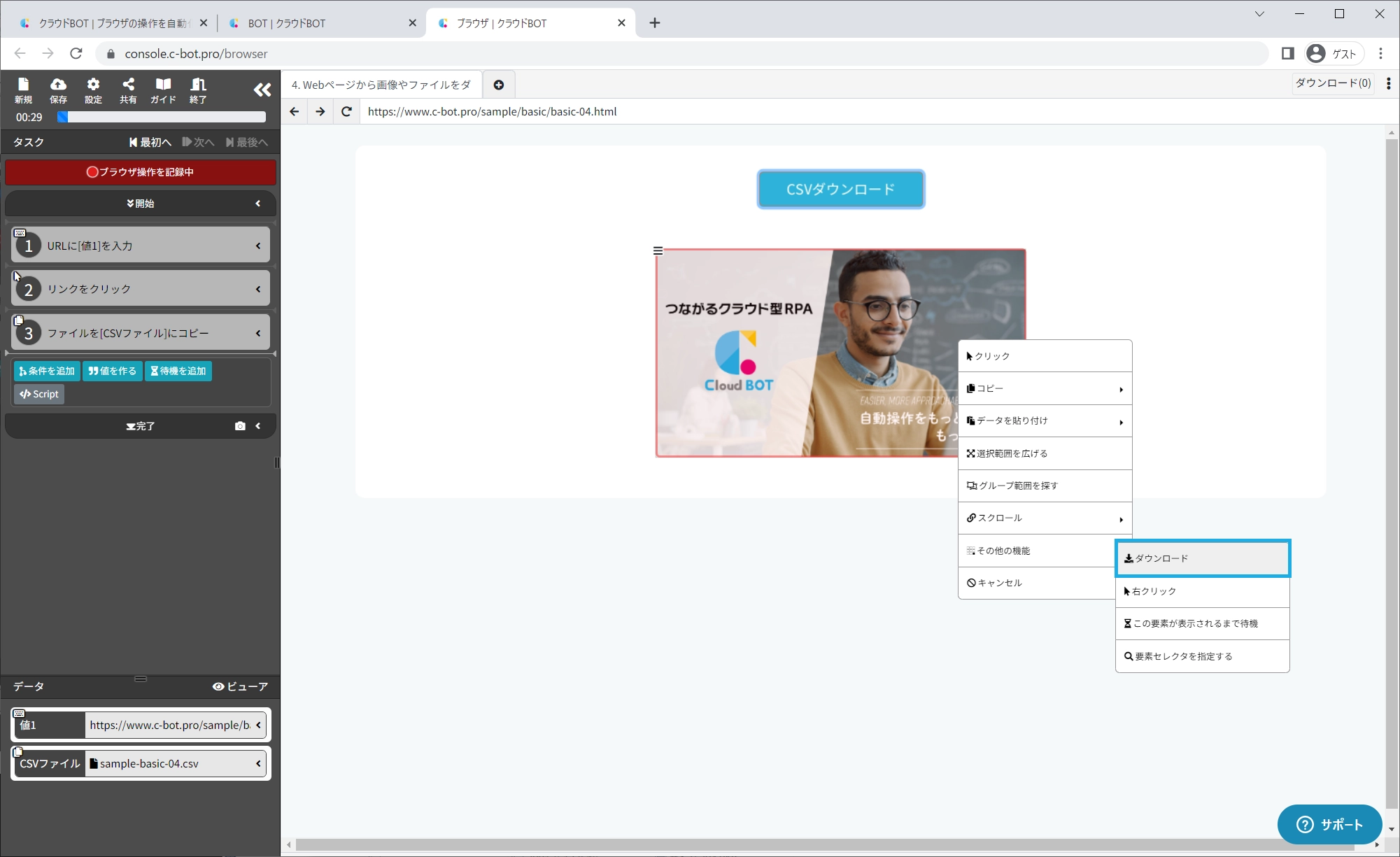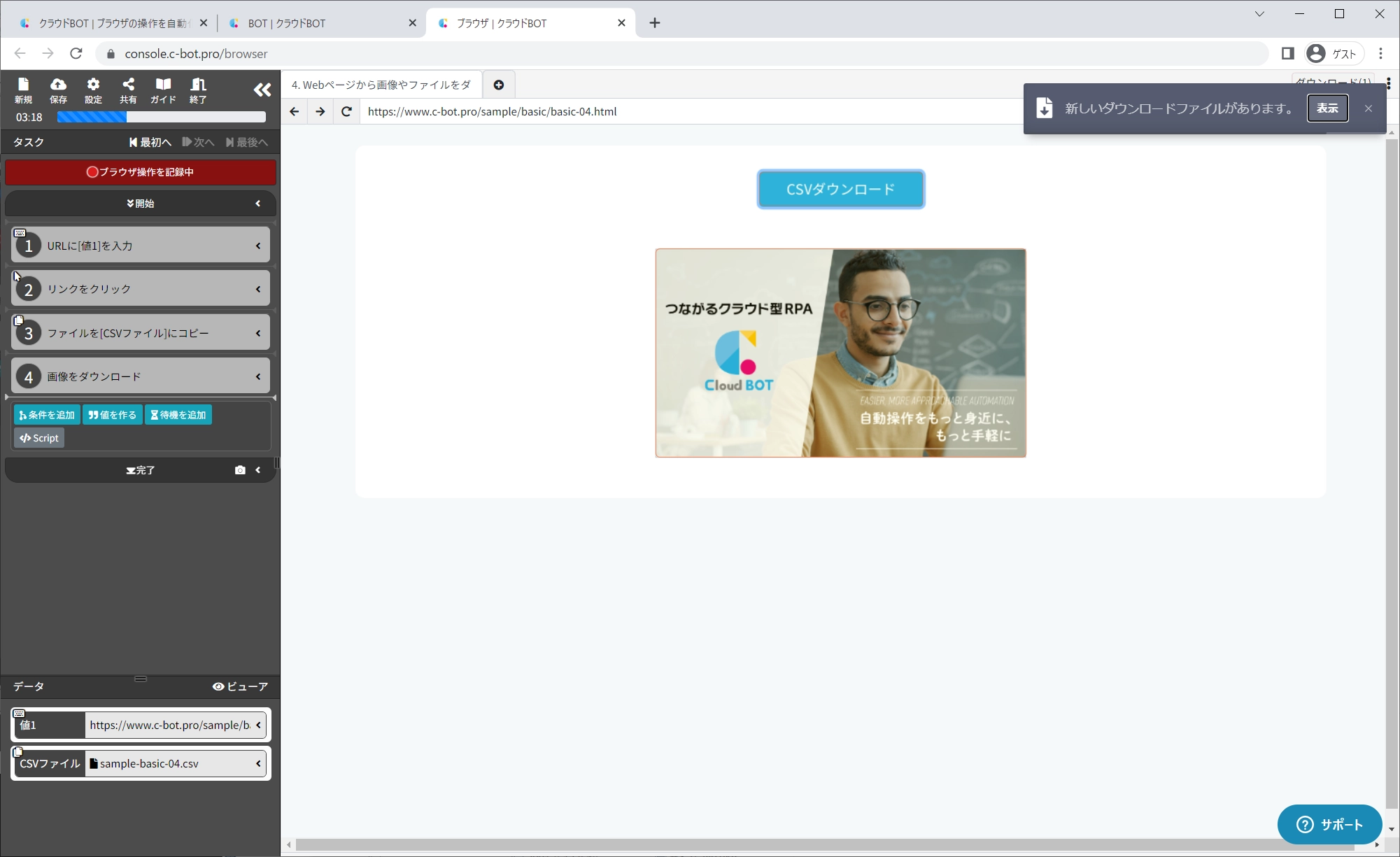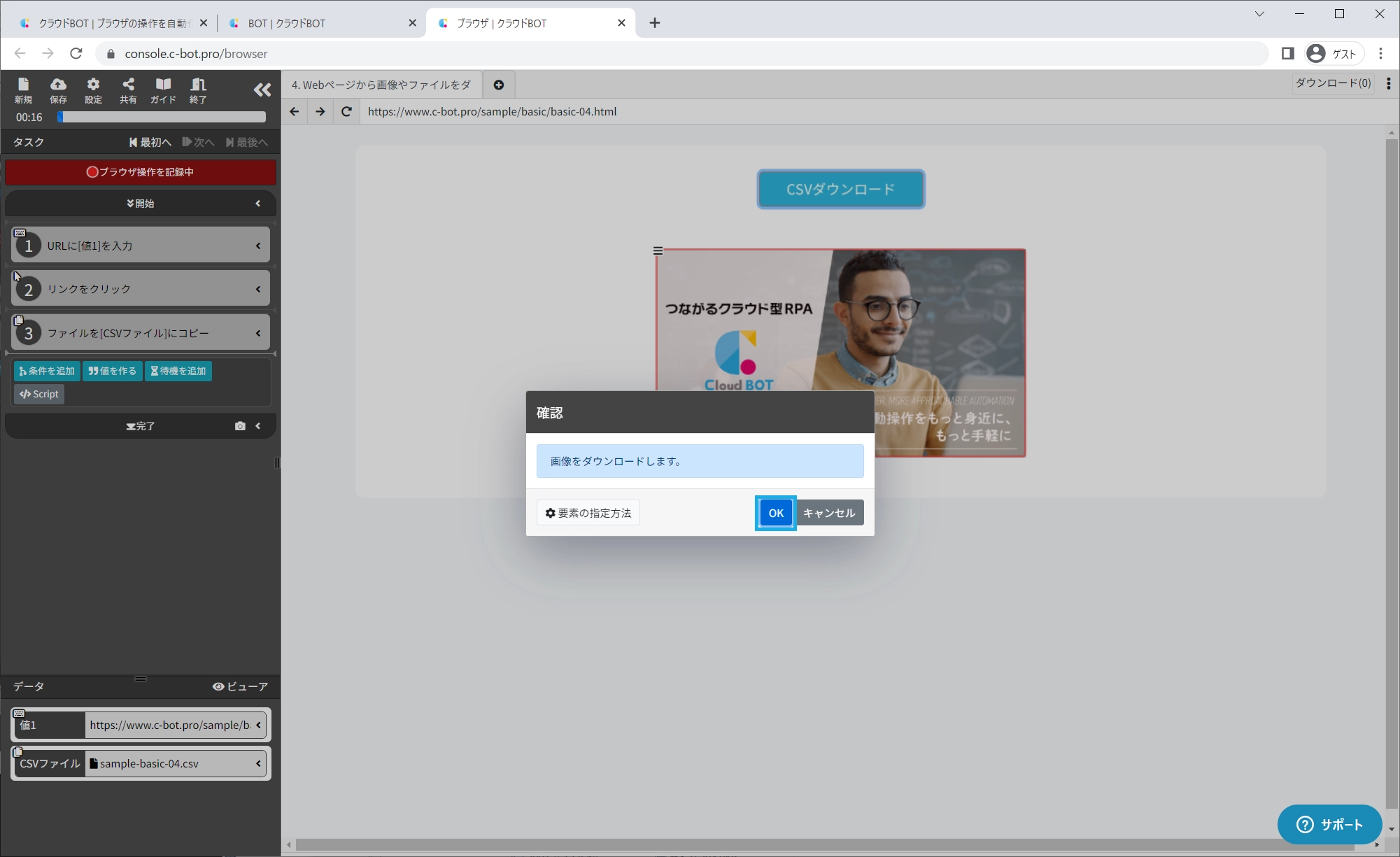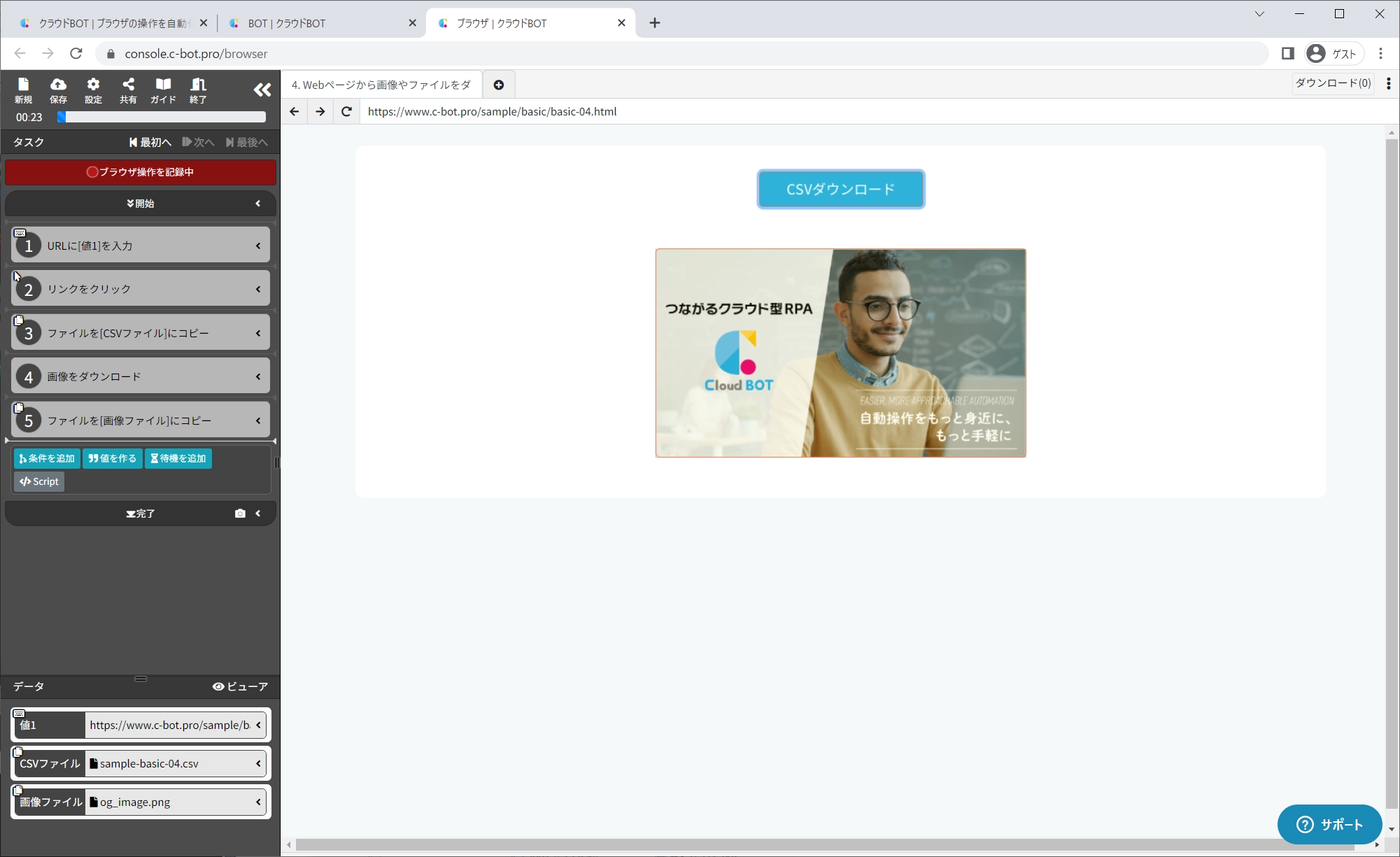 Webページ上からCSVファイルと画像ファイルをダウンロードするBOTを作成します。