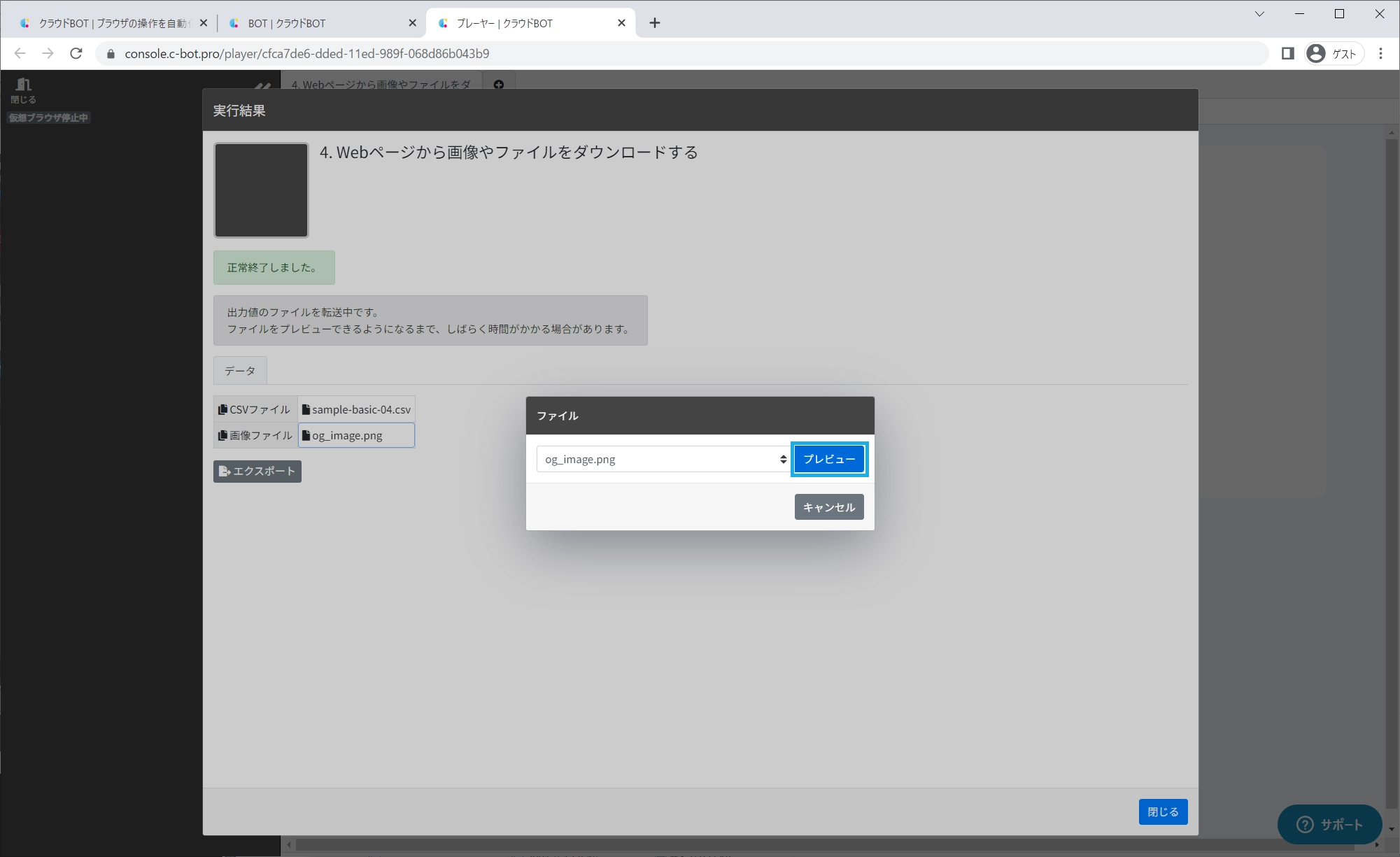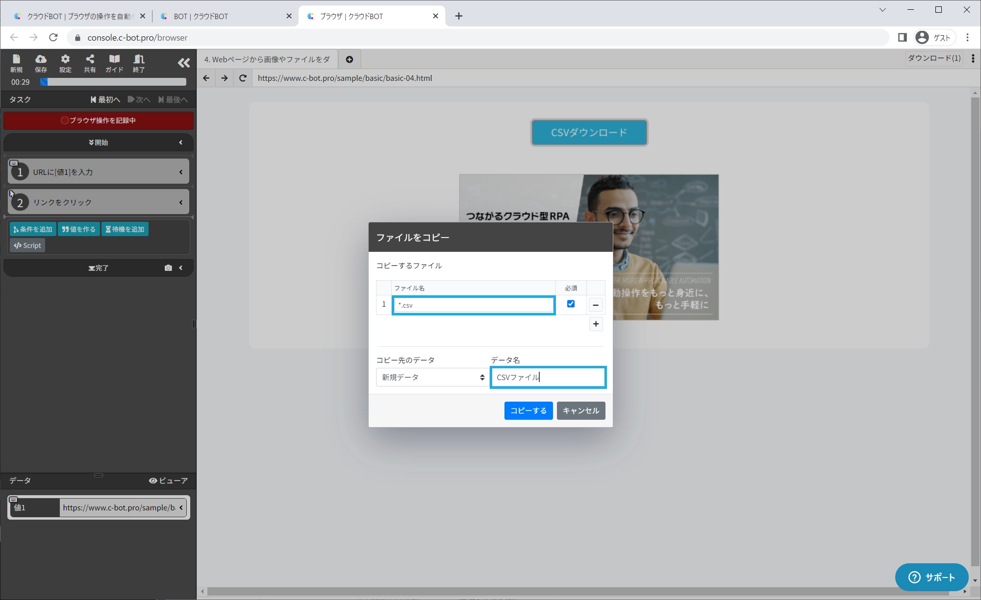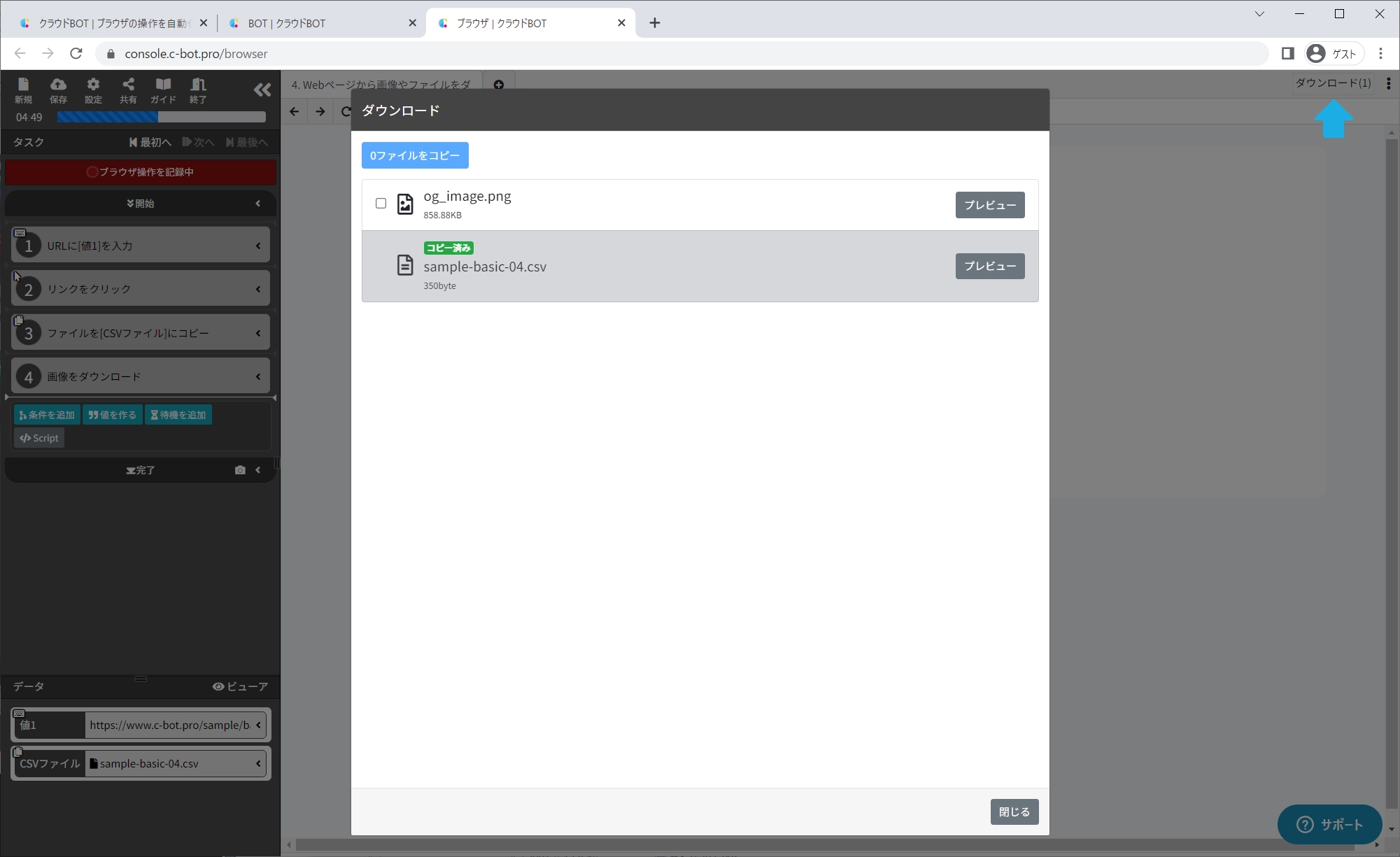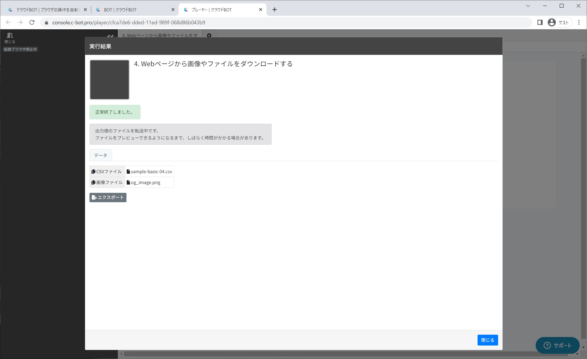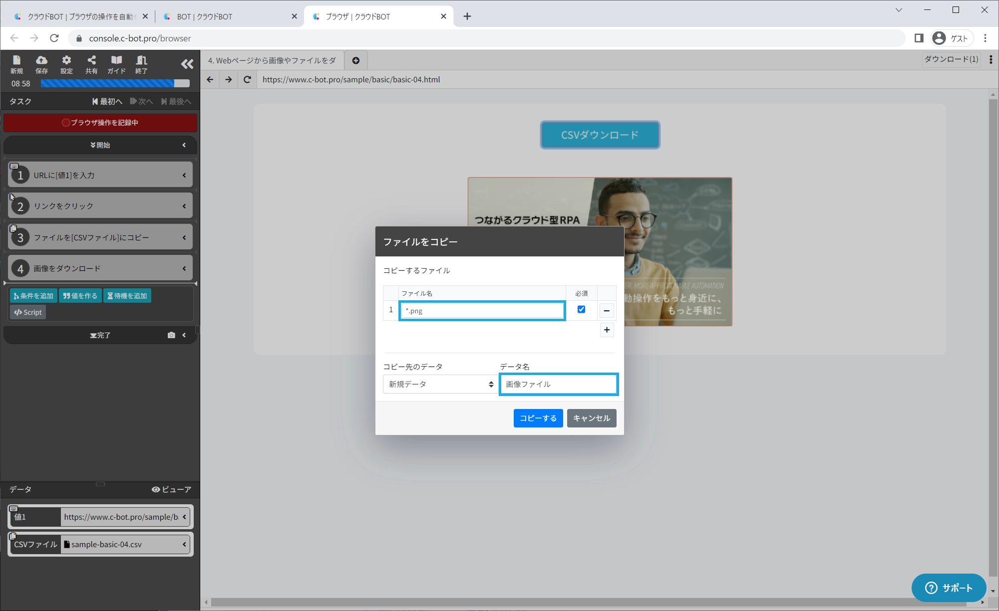 Webページ上からCSVファイルと画像ファイルをダウンロードするBOTを作成します。