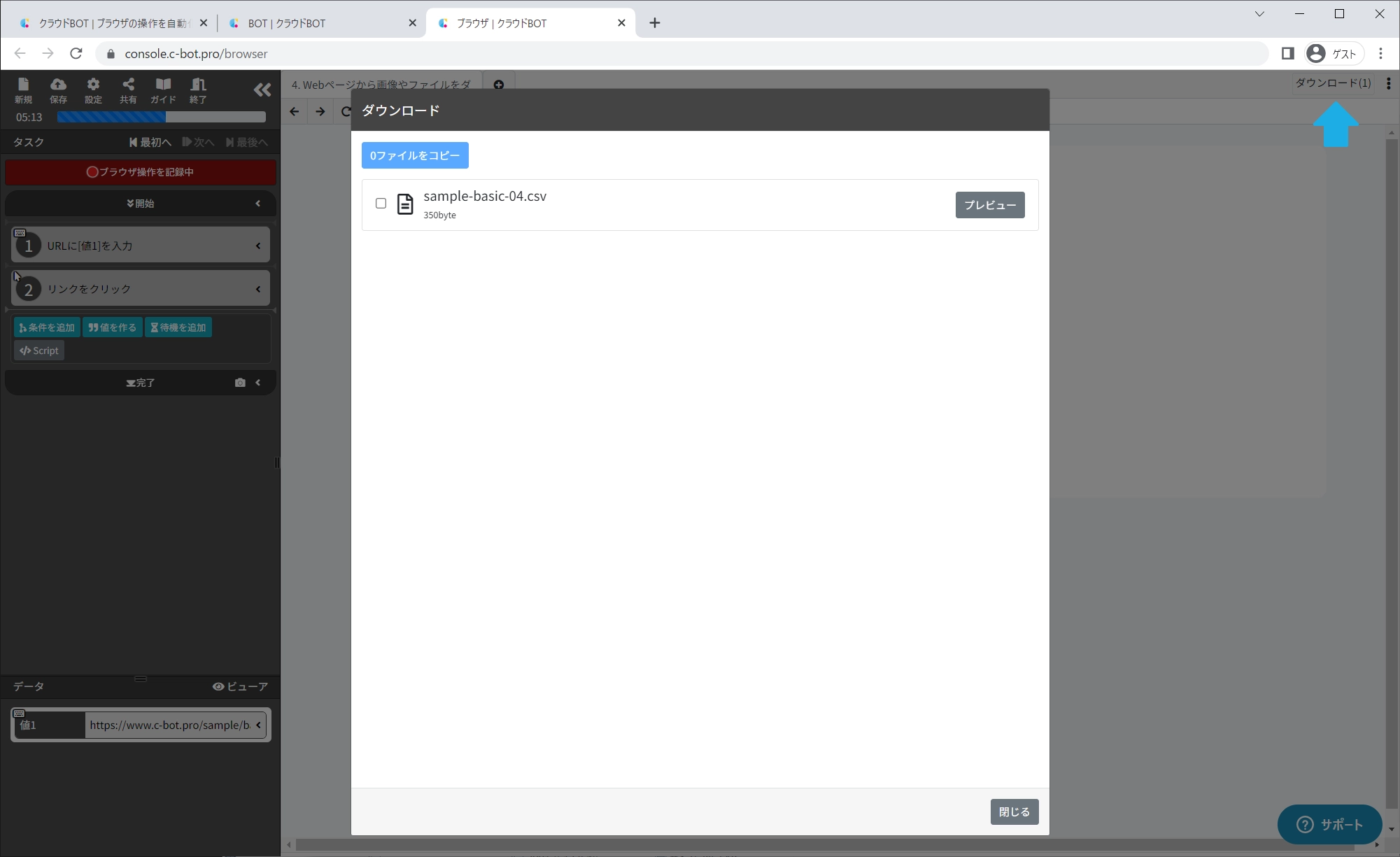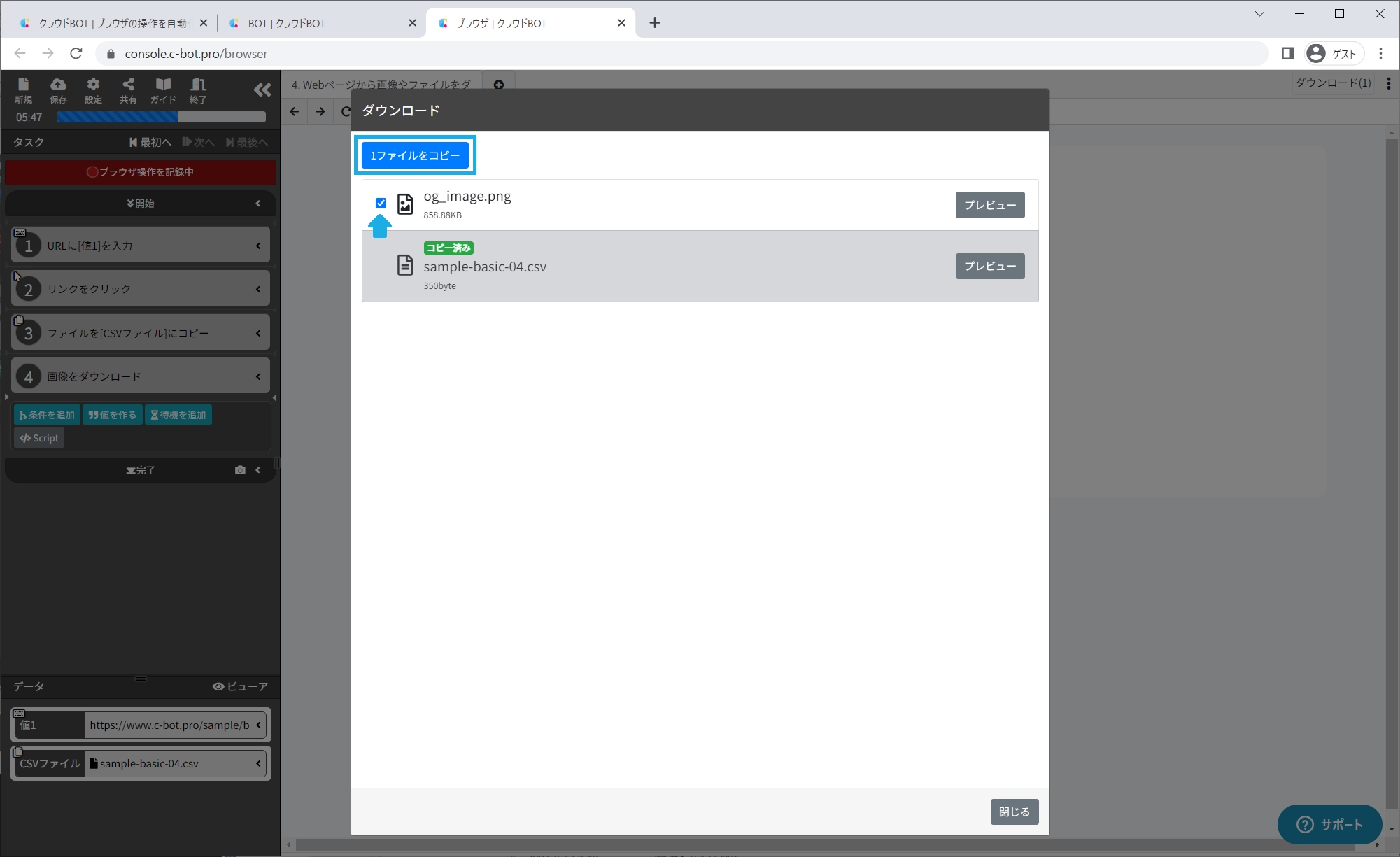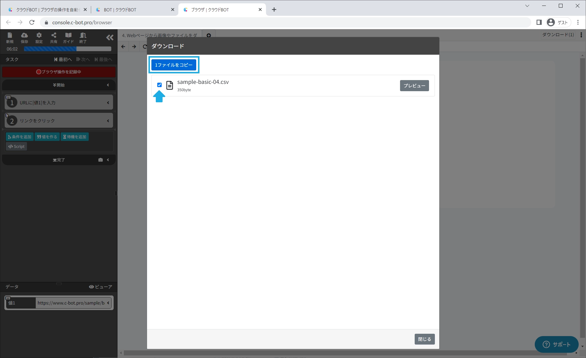 ・仮想ブラウザがダウンロードしたファイルをコピーするとBOTのファイルデータとして扱えます。