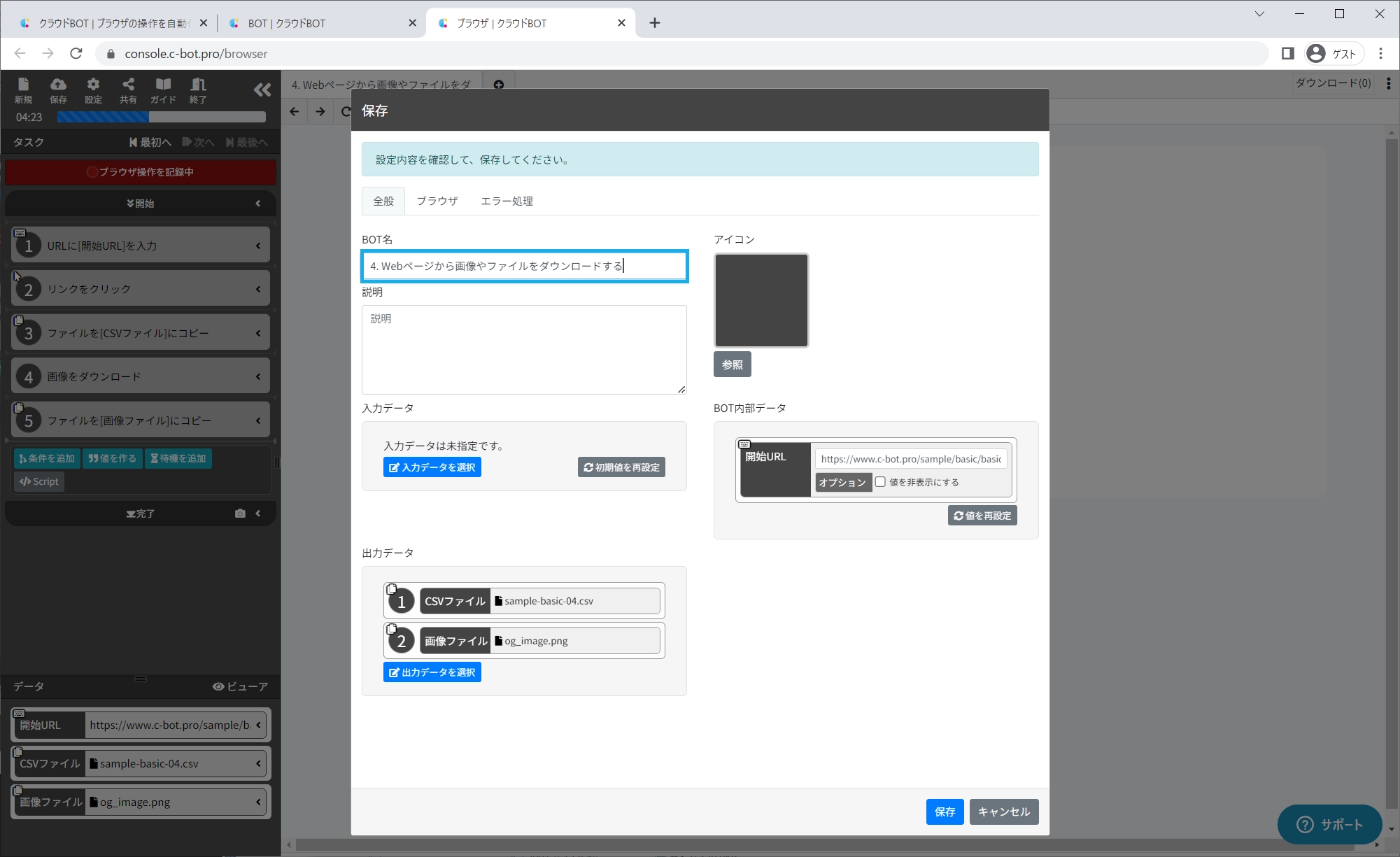 ”BOT名”を1-4. Webページから画像やファイルをダウンロードするに変更し、BOTを保存します。