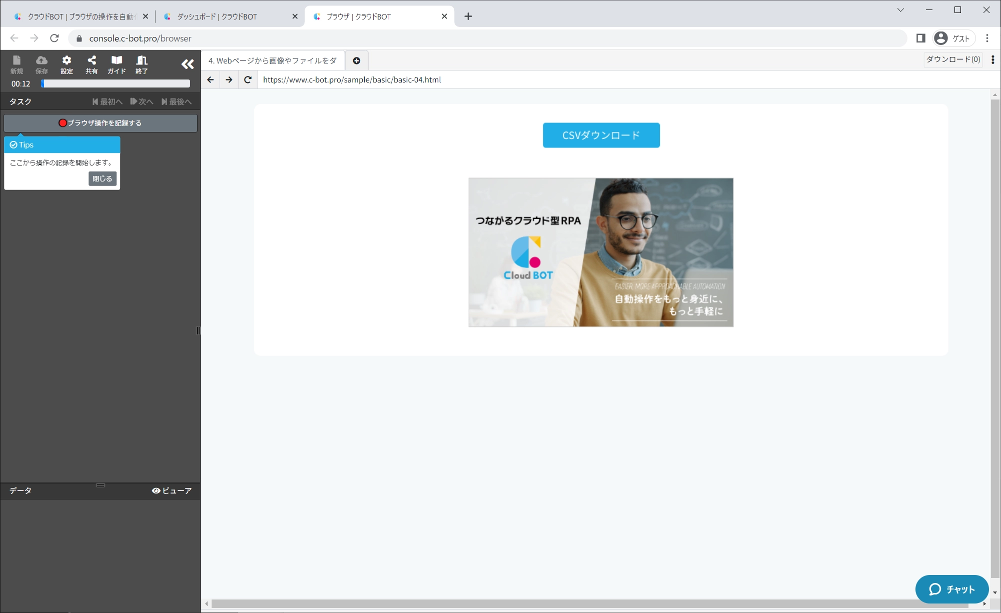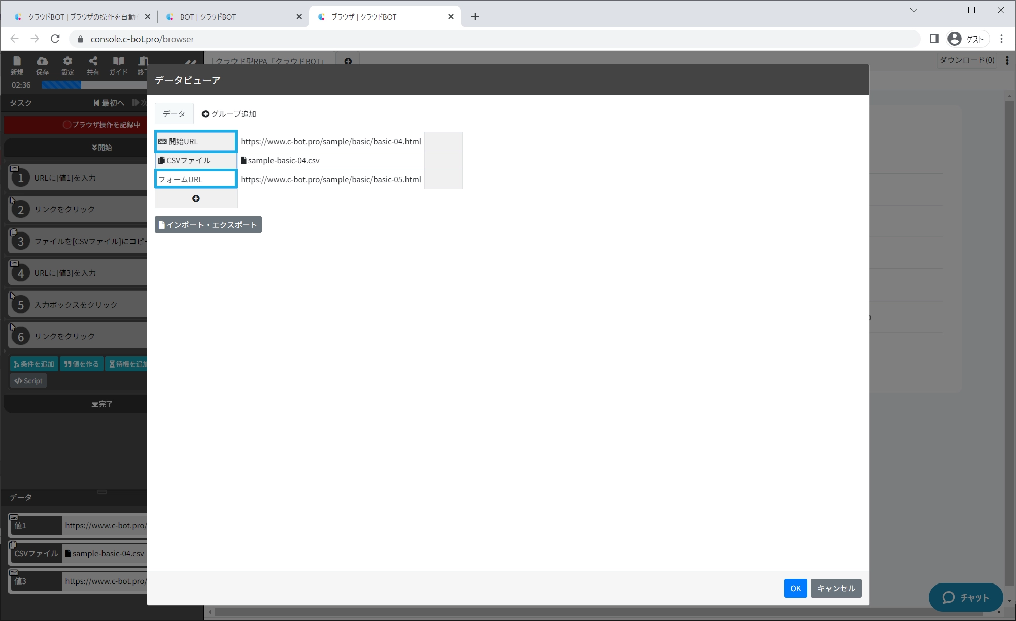 ※クラウドBOTの基本的な操作につきましては、『基本編 - 1-1. Webページからデータを取得する (基本操作の解説を含む)』をご参照下さい。
