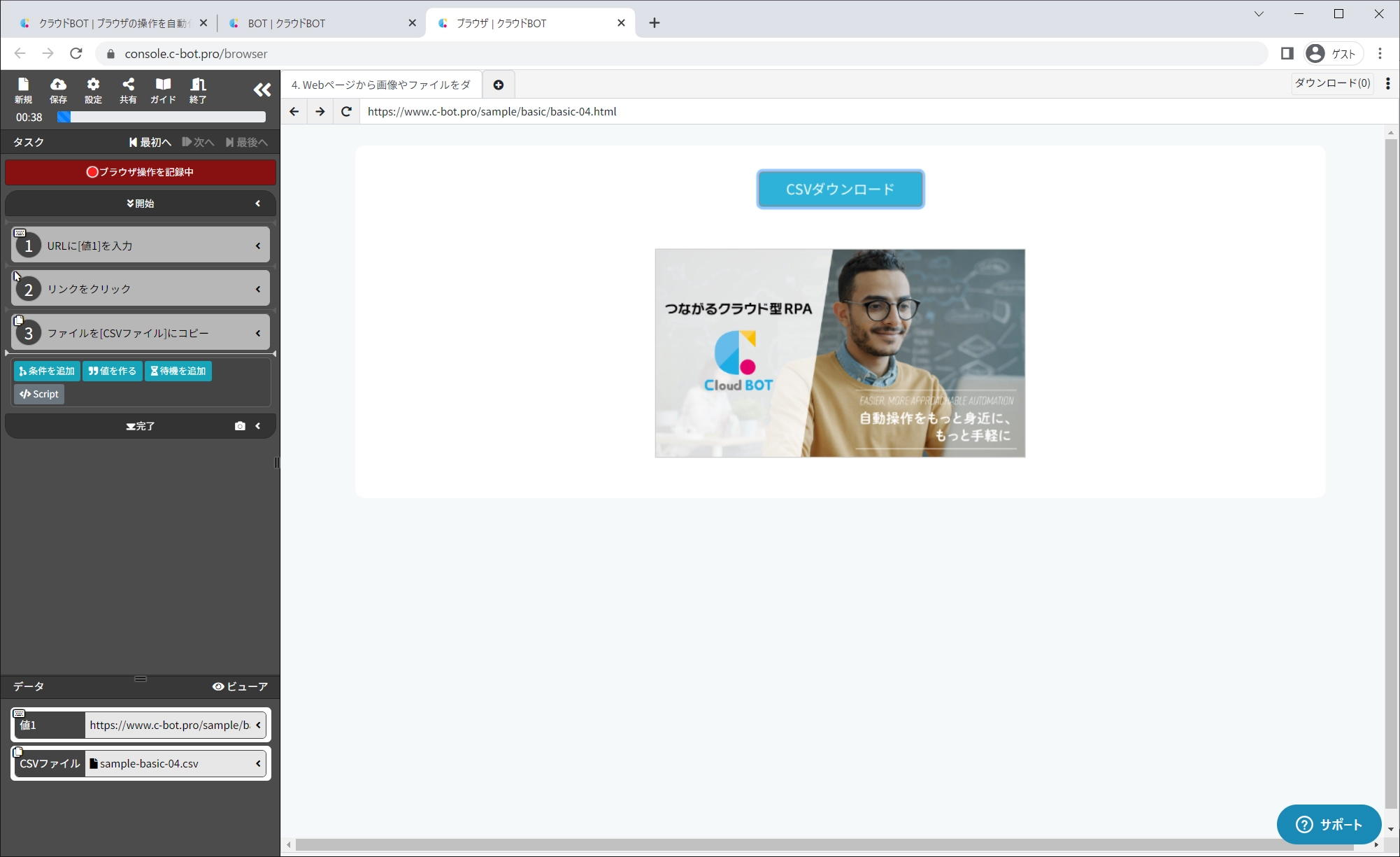 「CSVダウンロード」ボタンをクリックし、ダウンロードしたファイルをBOTのデータとしてコピーする操作を記録します。