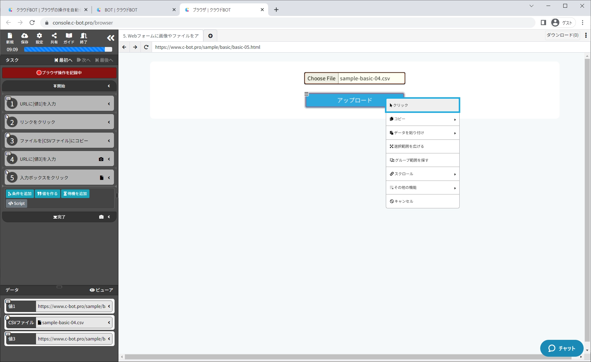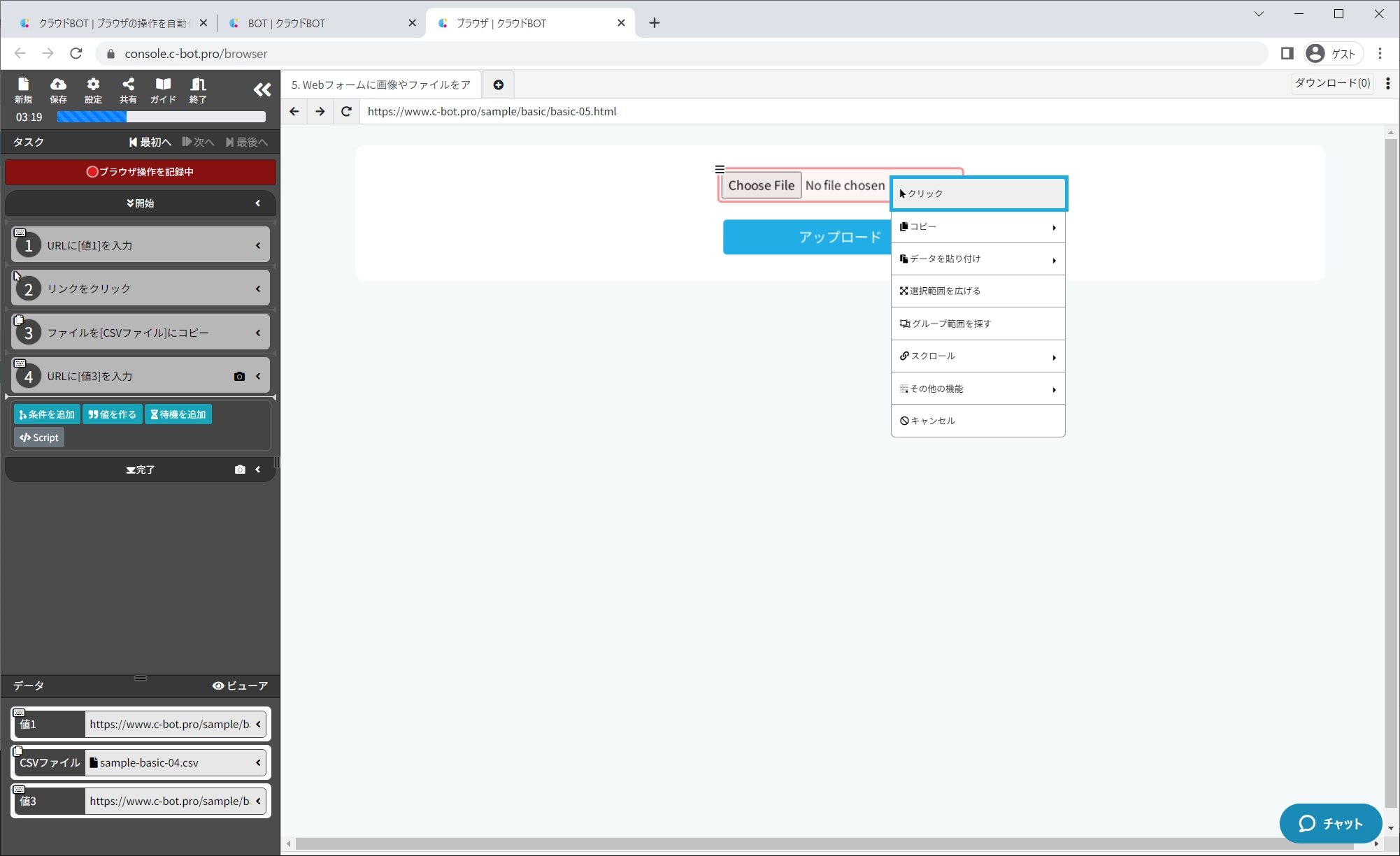 Webページ上からダウンロードしたCSVファイルを、別のWebページ内のフォームにアップロードし、送信するBOTを作成します。