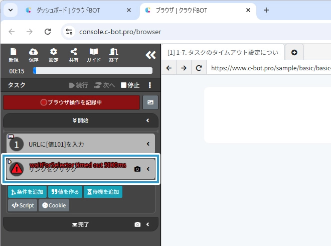 要素をクリックするタスクは、デフォルトで5秒のタイムアウト時間が設定されており、5秒以内に操作対象の要素が見つからない場合に上記エラーが発生します。