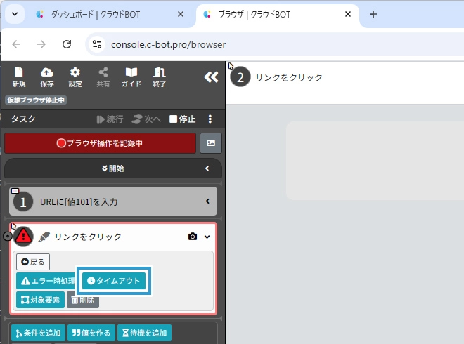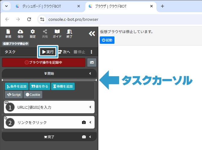 画面左上、タスクメニューの「停止」をクリックし、仮想ブラウザを停止します。これにより、タスクカーソルが最初に戻ります。