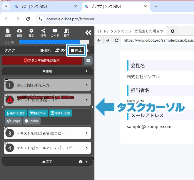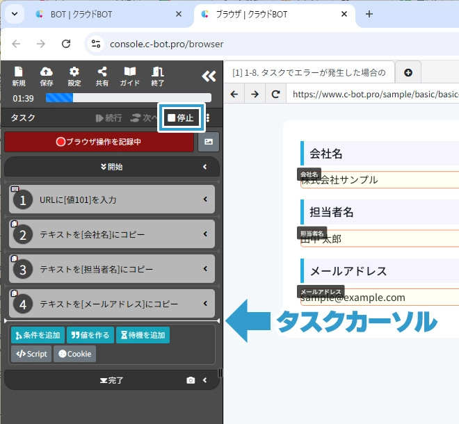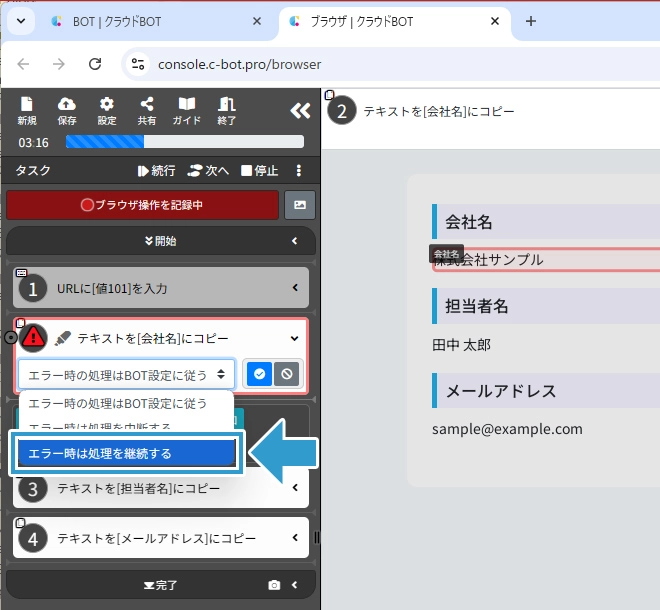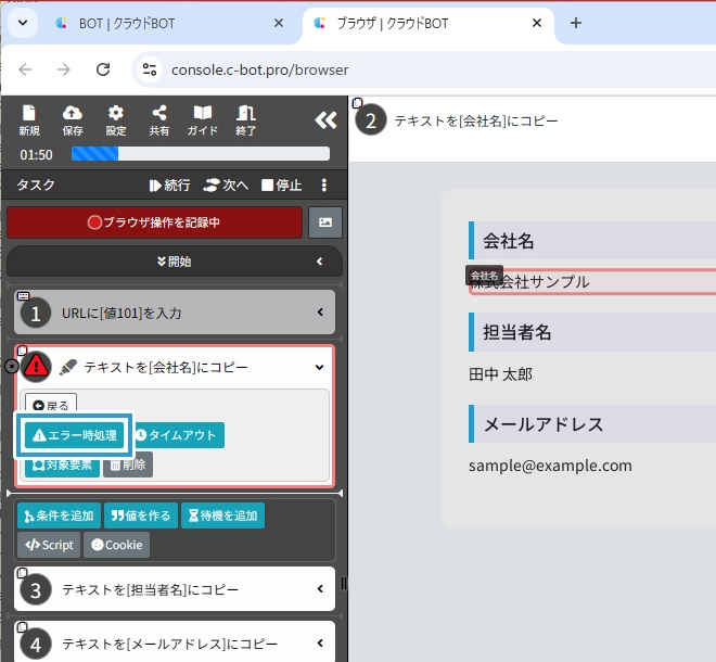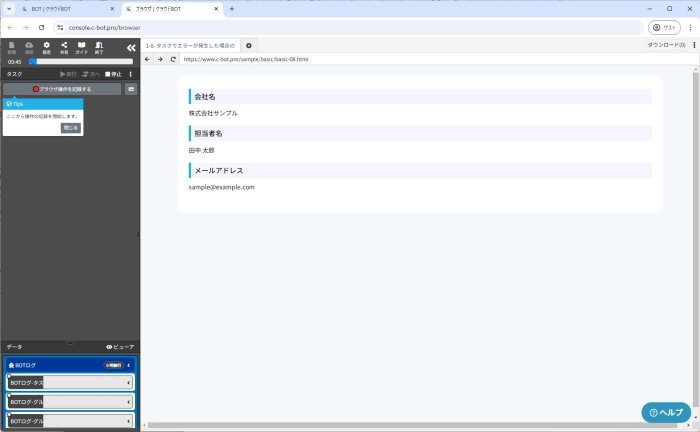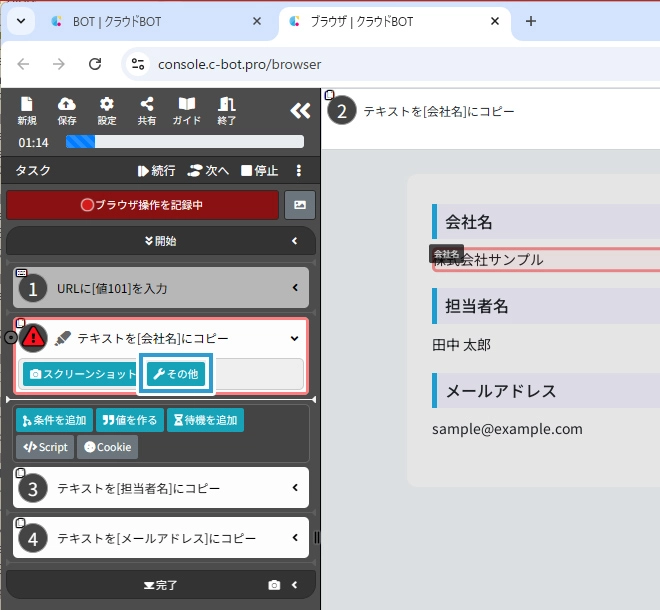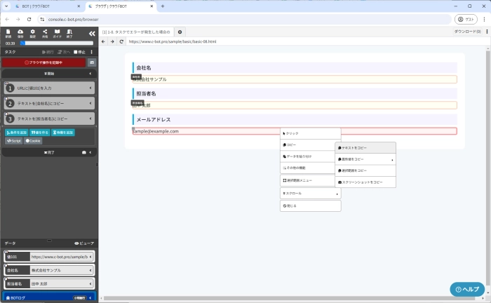 ページ内に表示されている、”株式会社サンプル”、”田中 太郎”、”sample@example.com”をそれぞれ、会社名、担当者名、メールアドレスとしてコピーする操作を記録します。