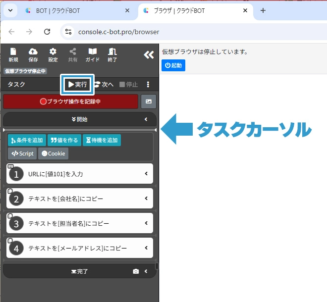 画面左上、タスクメニューの「停止」をクリックし、仮想ブラウザを停止します。これにより、タスクカーソルが最初に戻ります。