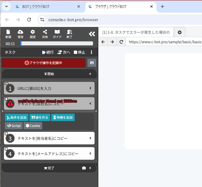 ”wait For Selector timed out 5000ms”のエラーが表示されますので、エラーになったタスク2をクリックします。