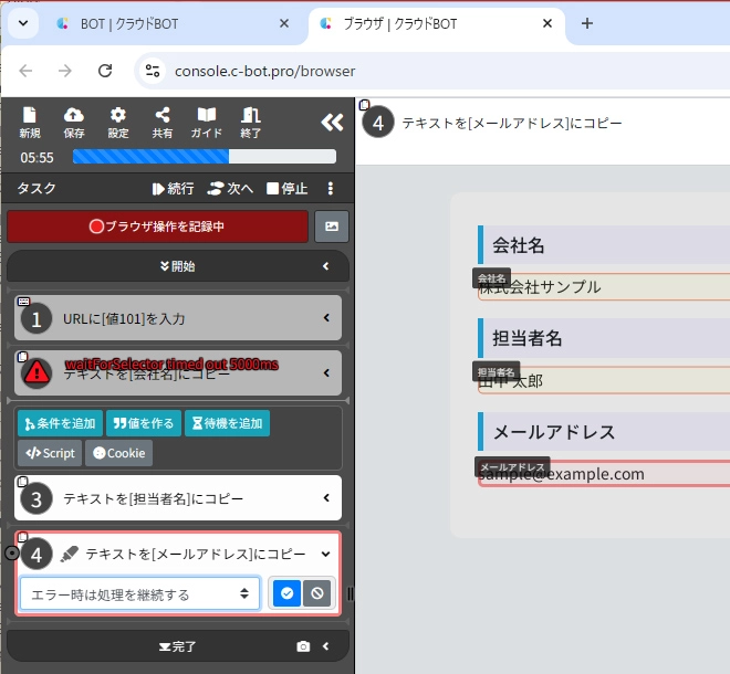 ”wait For Selector timed out 5000ms”が表示されタスクがエラーになっていますが、処理が最後まで進んでいることが確認できます。