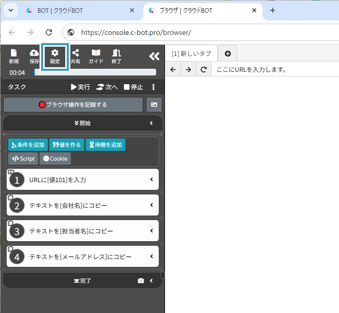 BOTエディタが開きますので、画面左上の「設定」をクリックします。