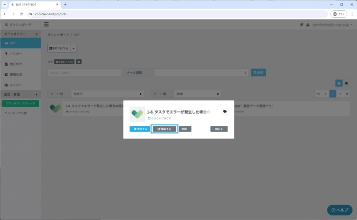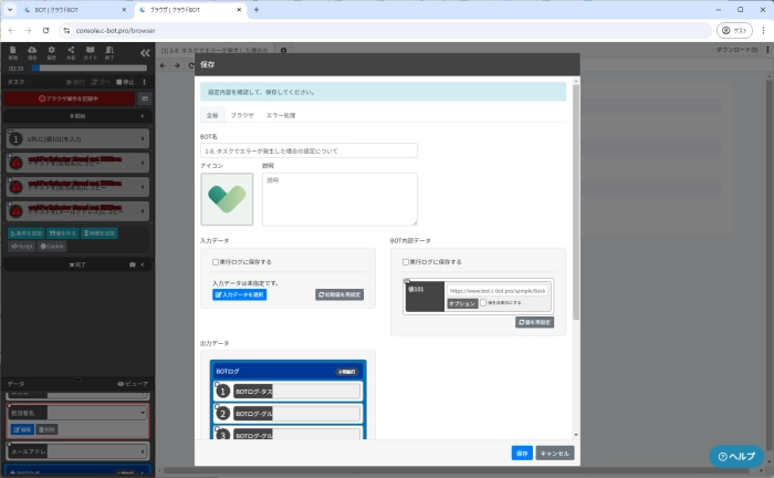 ”BOT名”を1-8. タスクでエラーが発生した場合の設定についてに変更し、BOTを保存します。