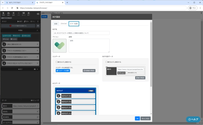タスク単位ではなく、BOTのデフォルト設定としてエラーが発生した際の処理を指定する事ができます。