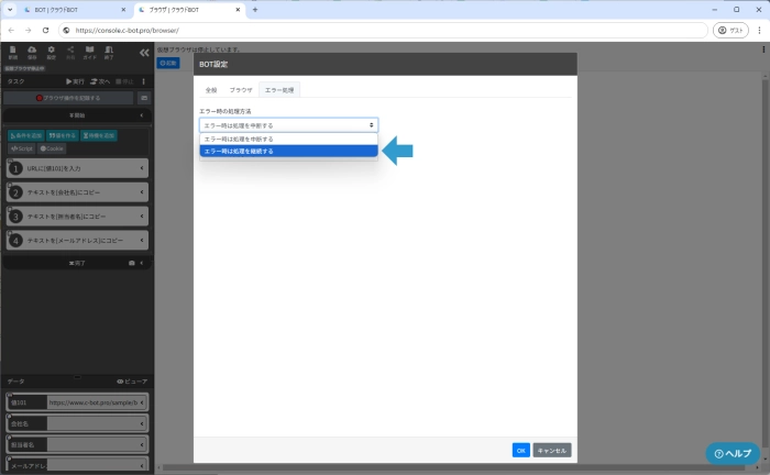 エラー発生時の処理を設定するプルダウンが表示されますので、”エラー時は処理を継続する”を選択し、青いチェックボタンをクリックします。