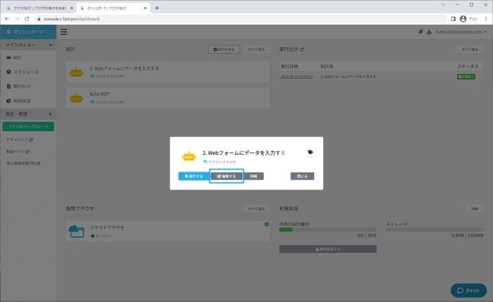 『1-2. Webフォームにデータを入力する』で作成したBOTを選択し、「編集する」ボタンからBOTエディタを開きます。