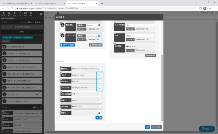 ”会社名”、”担当者名”、”メールアドレス”が出力データとして設定されます。