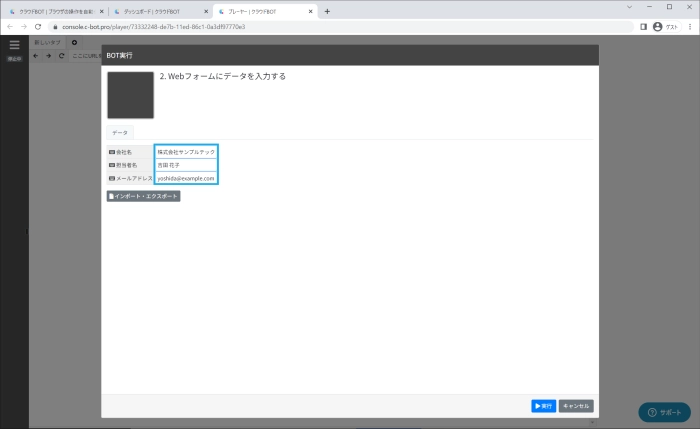 実行時に入力するデータが”会社名”,”担当者名”,”メールアドレス”に変更されています。
